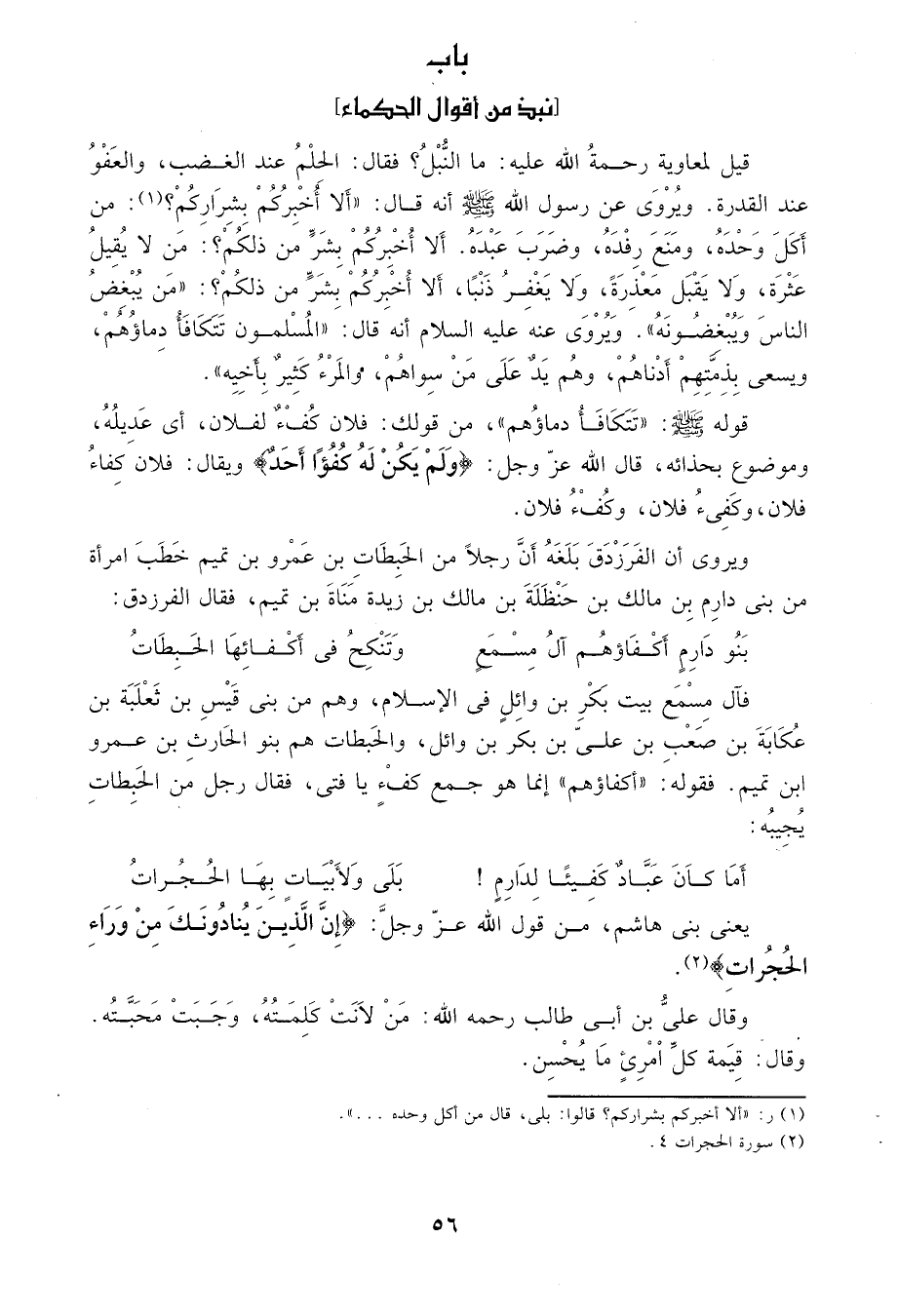 قيل لمعاوية رحمة الله عليه: ما النبل? فقال: الحلم عند الغضب، والعفو عند القدرة. ويروى عن رسول الله صَلَّى اللَّهُ عَلَيْهِ وَسَلَّمَ: "ألا أخبركم بشراركم?1 من أكل وحده، ومنع رفده، وضرب عبده، ألا أخبركم بشر بين ذلكم? من لا يقيل عثرة ولا يقبل معذرة ولا يغفر ذنباً ألا أخبركم بشر من ذلكم؟ من يبغض الناس ويبغضونه". ويروى عنه عليه السلام أنه قال: "المسلمون تتكافأ دماؤهم، ويسعى بذمتهم أدناهم، وهم يدً على من سواهم، والمرء كثير بأخيه" قوله صَلَّى اللَّهُ عَلَيْهِ وَسَلَّمَ: "تتكافأ دماؤهم"، من قولك: فلان كفء لفلان، أي عديله، وموضوع بحذائه، قال الله عز وجل: {وَلَمْ يَكُنْ لَهُ كُفُواً أَحَدٌ} ويقال: فلان كفاء فلان، وكفيء فلان، وكفء فلان.