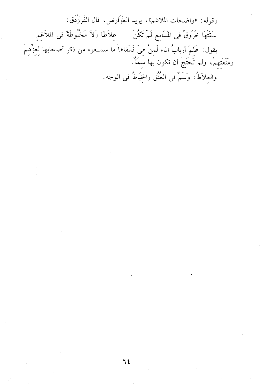 وقوله: "واضحات الملاغم" يريد العوارض، قال الفرزدق: