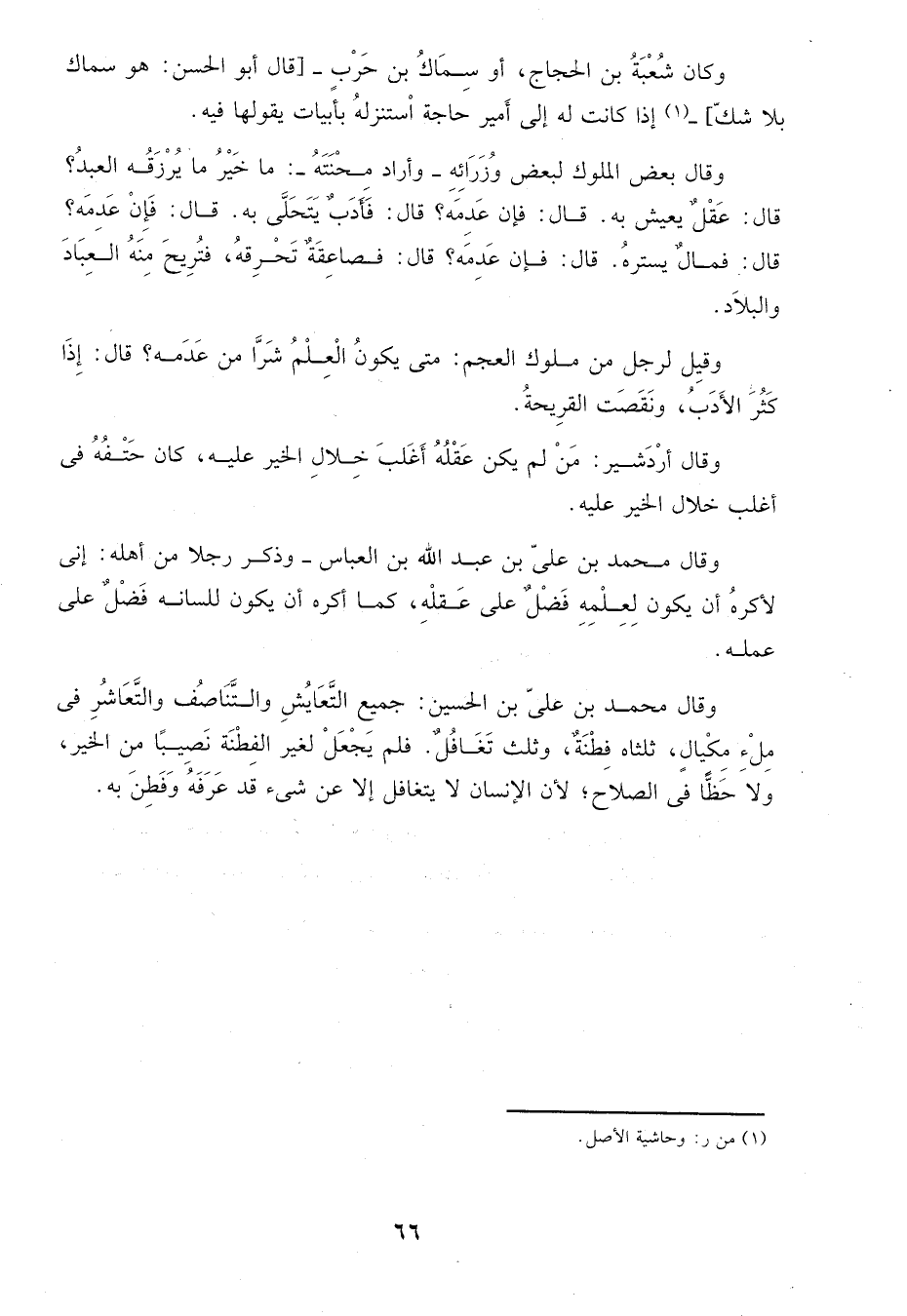 وقال محمد بن علي بن الحسين: جميع التعايش والتناصف والتعاشر في ملء مكيال، ثلثاه فطنة، وثلث تغافل فلم يجعل لغير الفطنة نصيباٌ من الخير، ولا حظاٌ في الصلاح، لأن الإنسان لا يتغافل إلا عن شىء قد عرفه وفطن به.