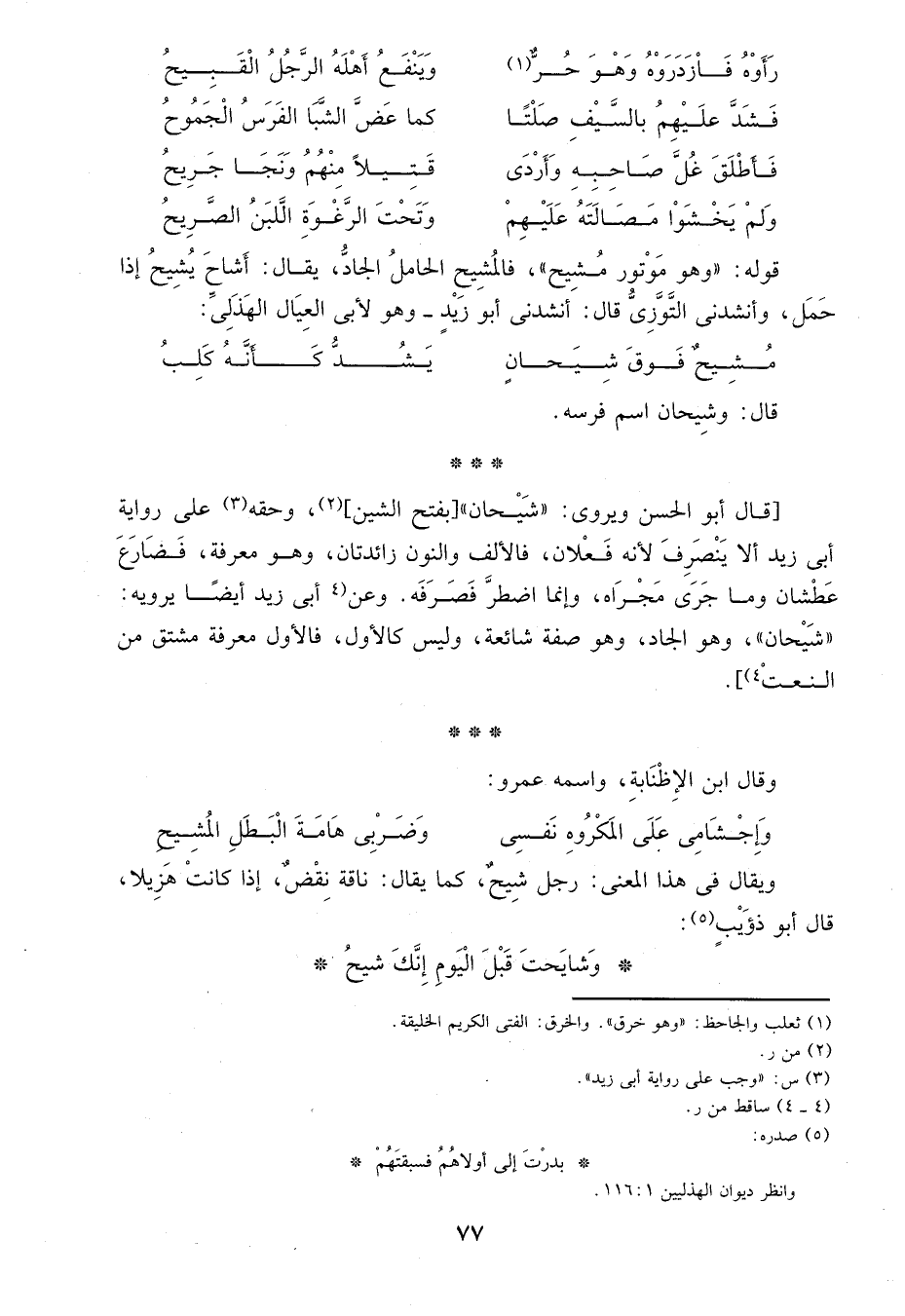 قال أبو الحسن ويروى: "شيحان" [بفتح الشين] 2، وحقه3 على رواية أبي زيد ألا ينصرف لأنه فعلان، فالألف والنون زائدتان، وهو معرفة، فضارع عطشان وما جرى مجراه، وإنما اضطر فصرفه. وعن4 أبي زيد أيضاً يرويه:" شيحان"، وهو الجاد، وهو صفة شائعة، وليس كالأول فالأول معرفة مشتق عن النعت4.