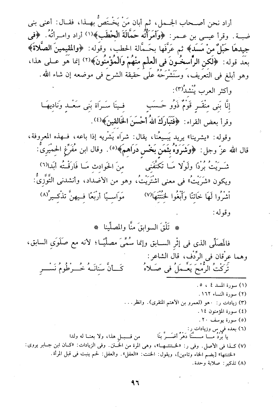 أراد نحن أصحاب الجمل، ثم أبان من يختص بهذا، فقال: أعني بني ضبة وقرأ عيسى بن عمر: {وَامْرَأَتُهُ حَمَّالَةَ الْحَطَبِ} 1أراد وامرأته: {فِي جِيدِهَا حَبْلٌ مِنْ مَسَدٍ} ثم عرفها بحمالة الحطب، وقوله: {وَالْمُقِيمِينَ الصَّلاةَ} بعد قوله: {لَكِنِ الرَّاسِخُونَ فِي الْعِلْمِ مِنْهُمْ وَالْمُؤْمِنُونَ} 2 إنما هو على هذا، وهو أبلغ في التعريف، وسنشرحه على حقيقة الشرح في موضعه إنشاء الله: وأكثر العرب ينشد3: