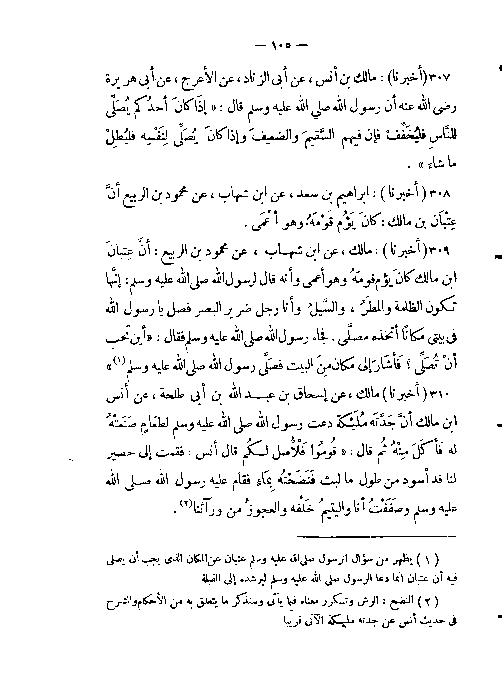 -أنَّ جَدَّتَه مُلَيْكة دعت رسول اللَّه صلى الله عليه وسلم لِطعَامٍ صَنَعتْهُ له فَأكَلَ مِنْهُ ثُم قال: "قُومُوا فَلأُصل لكُم قال أنس: فقمت إلى حصير لنا قد أسود من طول ما لبث فَنَضَحْتُه بِمَاءٍ فقام عليه رسول اللَّه صلى الله عليه وسلم وصَفَفْتُ أنا واليتيمُ خَلْفه والعجوزُ من ورآئنا -[106]- (النضح: الرش وتكرر معناه فيما يأتي وسنذكر مايتعلق به من الأحكام والشرح في حديث أنس عن جدته مليكة الآتي قريبا) .