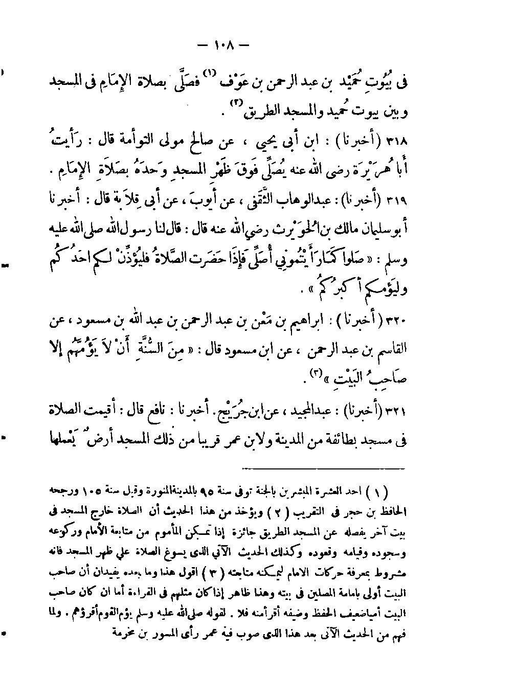 -أقيمت الصلاة في مسجد بطائفة من المدينة ولإبن عمر قريبا من ذلك المسجد أرضٌ يَعْملها -[109]- وإمام ذلك المسجد مولى له ومسكن ذلك المولى وأصحابه ثمة قال: فلما سمعهم عبد اللَّه جاء ليشهد معهم الصلاة، فقال له المولى صاحب المسجد تقدم فَصَلِّ فقال له عبد اللَّه أنت أحق أن تصلي في مسجدك مني فصلى المولى.
