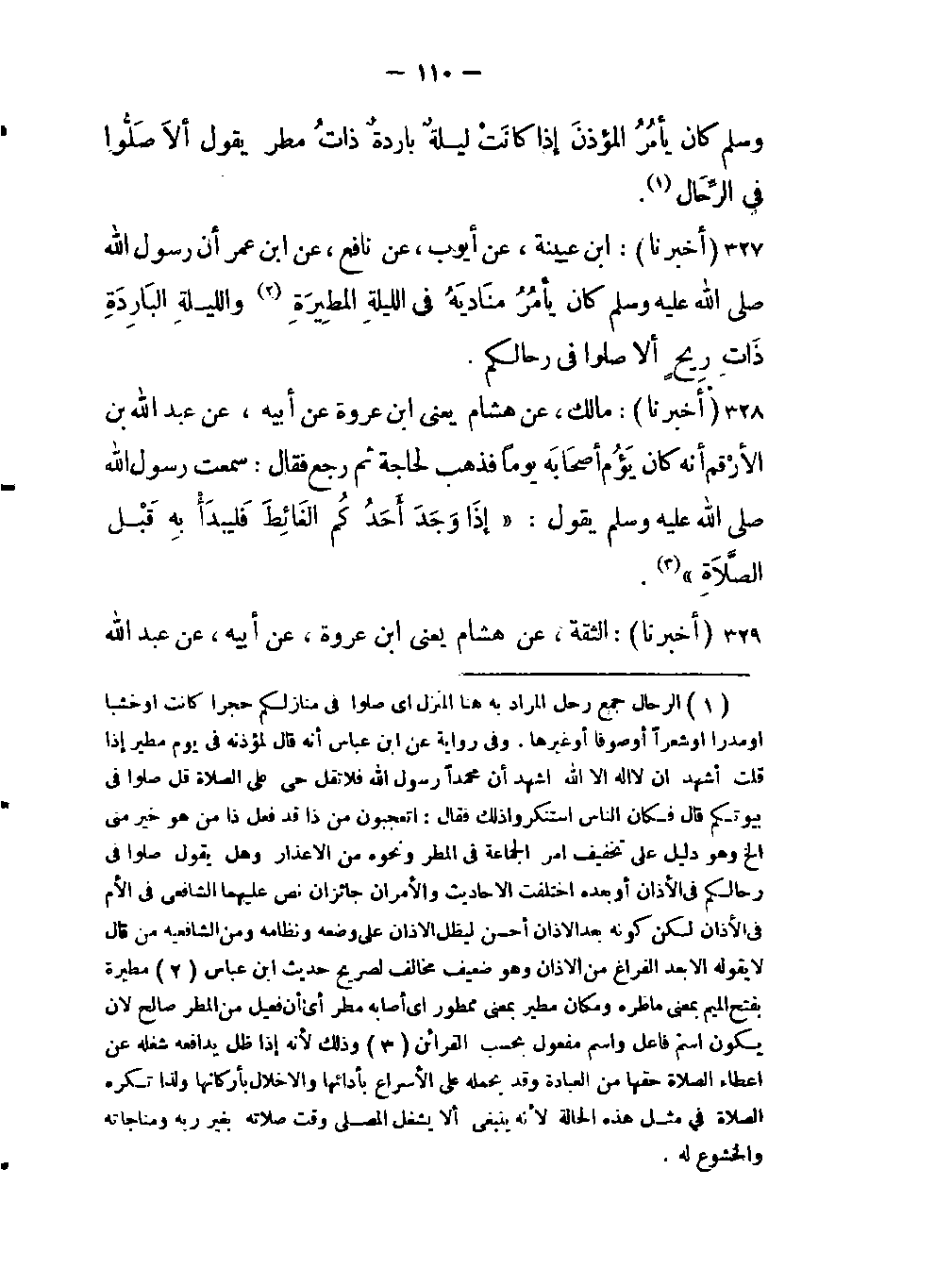 -أن رسول اللَّه صلى الله عليه وسلم كان يأمُرُ مُنَاديَهُ في الليلةِ المطِيرةِ (مطيرة بفتح الميم بمعنى ماظره ومكان مطير بمعنى ممطور أي أصابه مطر أي أن فعيل من المطر صالح لأن يكون اسم فاعل واسم مفعول بحسب القرائن) والليلةِ البَارِدِةِ ذَاتِ رِيحٍ ألا صلوا في الرحال.