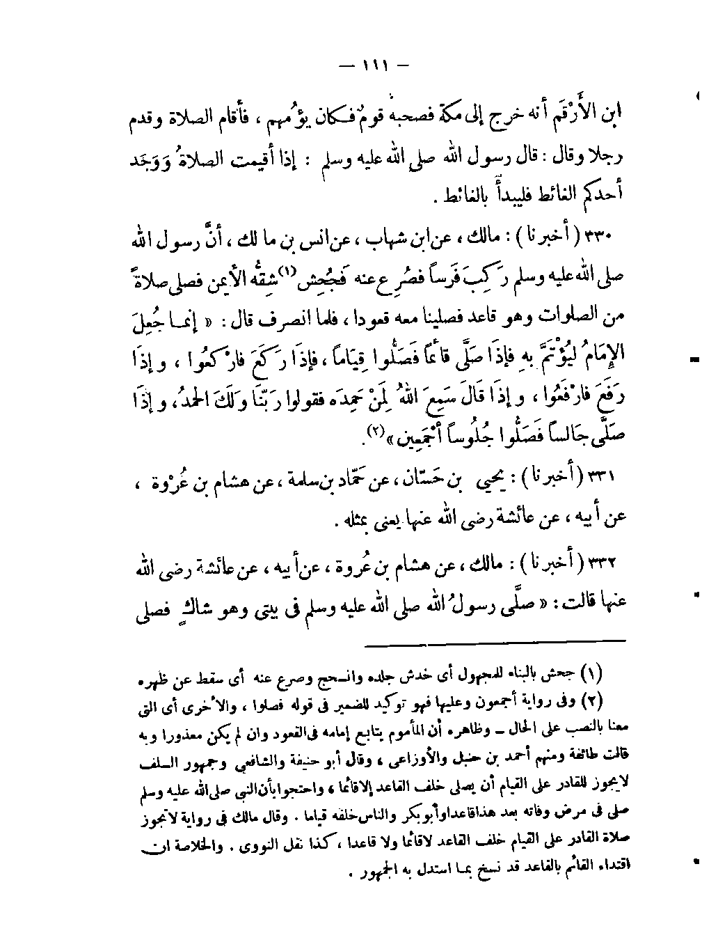 332- (أخبرنا) : مالك، عن هشام بن عروة، عن أبيه، عن عائشة رضي اللَّه عنها قالت: "صلّى رسول اللَّه صلى الله عليه وسلم في بيتي وهو شاكٍ فصلى -[112]- جالسا وصلى خلفهُ قِيامَاً فأشار إليهمْ أن إجْلِسُوا، فلما انصرف قال: "إنما جُعِلَ الإِمَامُ لِيُؤْتَمّ بِهِ، فإذَا رَكَعَ فاركَعُوا، وإذا رفَعَ فارْفَعُوا، وإذَا صَلَّى جالساً فَصَلُّوا جلُوساً أجمعين (قلنا إن في هذا روايتان الرفع على التوكيد للضمير في فصلوا والنصب عل الحالية منه هذا والأحاديث الواردة من بعد هذا فيها أن أبا بكر والناي كانوا قياما فنسخ الآخر الأول كما قدمنا) .