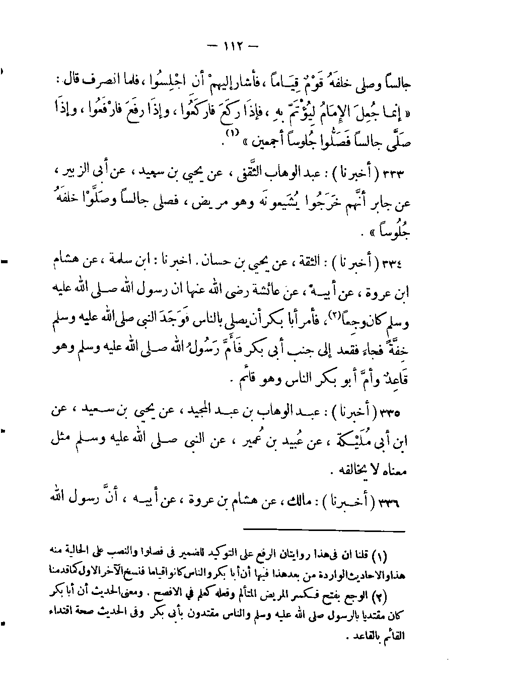 -أنَّ رسول اللَّه -[113]- صلى الله عليه وسلم خَرَجَ في مَرَضِه فَأتى أبا بكر وهو قائم يُصَلِّي بالنَّاسِ، فاستأخر أبو بكر فأشَار إليه رَسُولُ اللَّه صلى الله عليه وسلم أنْ كَما أنْتَ، فجلس رسول اللَّه صلى الله عليه وسلم إلى جنب أبي بكر فكان أبو بكر يصلي بِصَلاةِ رسول اللَّه صلى الله عليه وسلم، وكان النَّاسُ يُصَلُّونَ بِصَلاَةِ أبي بكر.