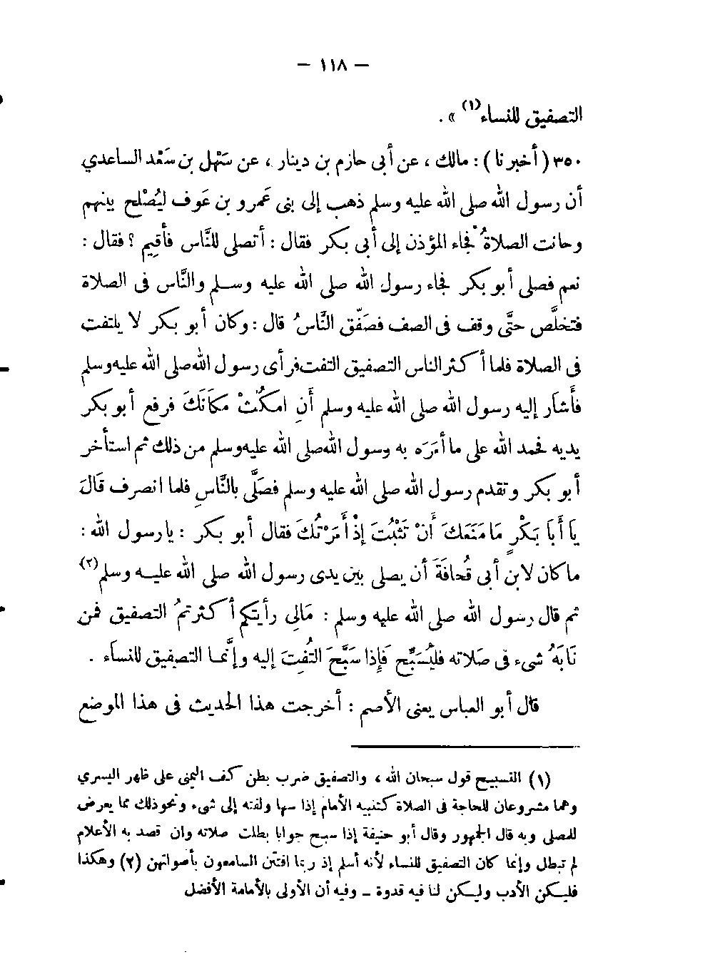 -أنَّ رسول اللَّه صلى اللَّه عليه وسلم ذَهَبَ إلى بني عمرو بن عوف ليُصلح بينهم وحانت الصلاةُ فجاء المؤذن إلى أبي بكر فقال: أتصلي للنَّاس فأقِيم؟ فقال: نعم فصلى أبو بكر فجاء رسول اللَّه صلى اللَّه عليه وسلم والنَّاس في الصلاة فتخلَّص حتَّى وقف في الصف فصَفّق النَّاسُ قال: وكان أبو بكر لا يلتفت في الصلاة فلما أكثر الناس التصفيق التفت فرأى رسول اللَّه صلى اللَّه عليه وسلم فأشَار إليه رسول اللَّه صلى اللَّه عليه وسلم أَنْ امكُث مكَانَكَ فرفع أبو بكر يديه فحمد اللَّه على ما أمَرَه به رسول اللَّه صلى اللَّه عليه وسلم من ذلك ثم استأخر أبو بكر وتقدم رسول اللَّه صلى اللَّه عليه وسلم فصَلَّى بالنَّاسِ فلما انصرف قَالَ يَا أبَا بَكْرٍ مَا مَنَعَكَ أَنْ تَثْبُتَ إذْ أَمَرْتُكَ فقال أبو بكر: يا رسول اللَّه: ما كان لأبن أبي قُحَافَةَ أن يصلي بين يدي رسول اللَّه صلى اللَّه عليه وسلم (وهكذا فليكن الأدب وليكن لنا قدوة وفيه أن الأولى بالإمامة الأفضل) ثم قال رسول اللَّه صلى اللَّه عليه وسلم: مَالِي رَأَيتُكُمْ أكثَرتم التصفيقَ فمَنْ نَابَه شئ في صَلاَته فَلْيُسَبِّحْ فَإِذا سَبَّح الْتُفِتَ إليه وإنَّما التصفيق للنساء.