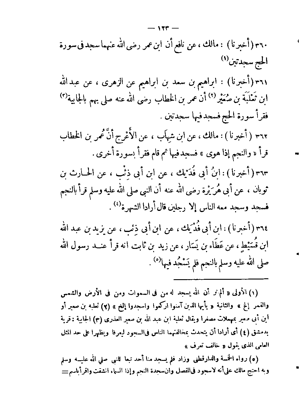 -أن عمر رضي اللَّه عنهما سجد في سورة الحج سجدتين (الأولى ألم تر أن اللَّه يسجد له من في السموات ومن في الأرض والشمس والقمر إلخ «والثانية» يأيها الذين آمنوا اركعوا واسجدوا إلخ") .