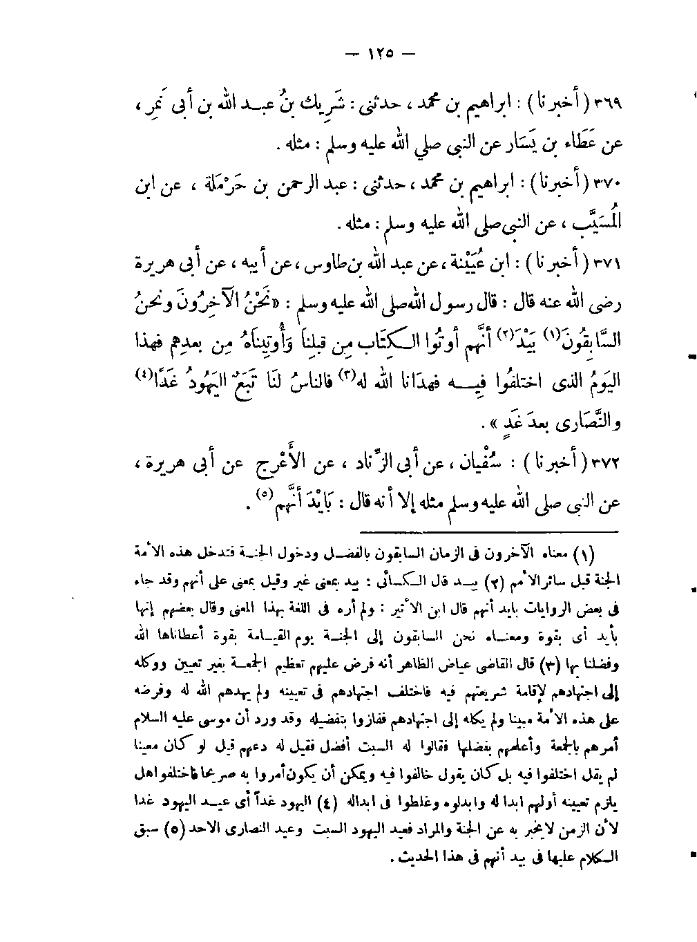 -قال رسول اللَّه صلى اللَّه عليه وسلم: "نَحْنُ الآخِرونَ ونَحْنُ السّاَبِقون (معناه الآخرون في الزمان السابقون بالفضل ودخول الجنة فتدخل هذه الأمة الجنة قبل سائر الأمم) بَيْدَ (بيد قال الكسائي: بيد بمعنى غير وقيل بمعنى على أنهم وقد جاء في بعض الروايات بايد أنهم قال إبن الأثير: ولم أره في اللغة بهذا المعنى وقال بعضهم إنها بأيد أي بقوة ومعناه نحن السابقون إلى الجنة يوم القيامة بقوة أعطاناها اللَّه وفضلنا بها) أنَّهم أوتُوا الكِتَاب مِن قبلِنَا وَأُتِينَاهُ مِن بعدِهم فهذا اليَومُ الذي اختلفوا فيه فهدانا اللَّه له (قال القاضي عياض الظاهر أنه فرض عليهم تعظيم الجمعة بغير تعيين ووكله إلى إجتهادهم لإقامة شريعتهم فيه فاختلف اجتهادهم في تعيينه ولم يهدهم اللَّه له وفرضه على هذه الأمة مبينا ولم يكله إلى اجتهادهم ففازوا بتفضيله وقد ورد أن موسى عليه السلام أمرهم بالجمعة وأعلمهم بفضلها فقالوا له السبت أفضل فقيل له دعهم قيل لو كان معينا لم يقل اختلفوا فيه بل كان يقول خالفوا فيه ويمكن أن يكون أمروا به صريحا فاختلفوا هل يلزم تعيينه أولهم ابدا له وابدلوه وغلطوا في ابداله) فالناسُ لنَا تَبَعٌ اليَهُودُ غَدَاً (اليهود غدا أي عيد اليهود غدا لأن الزمن لا يخبر به عن الجنة والمراد فعيد اليهود السبت وعيد النصارى الأحد) والنَّصَارى بعدَ غَدٍ".