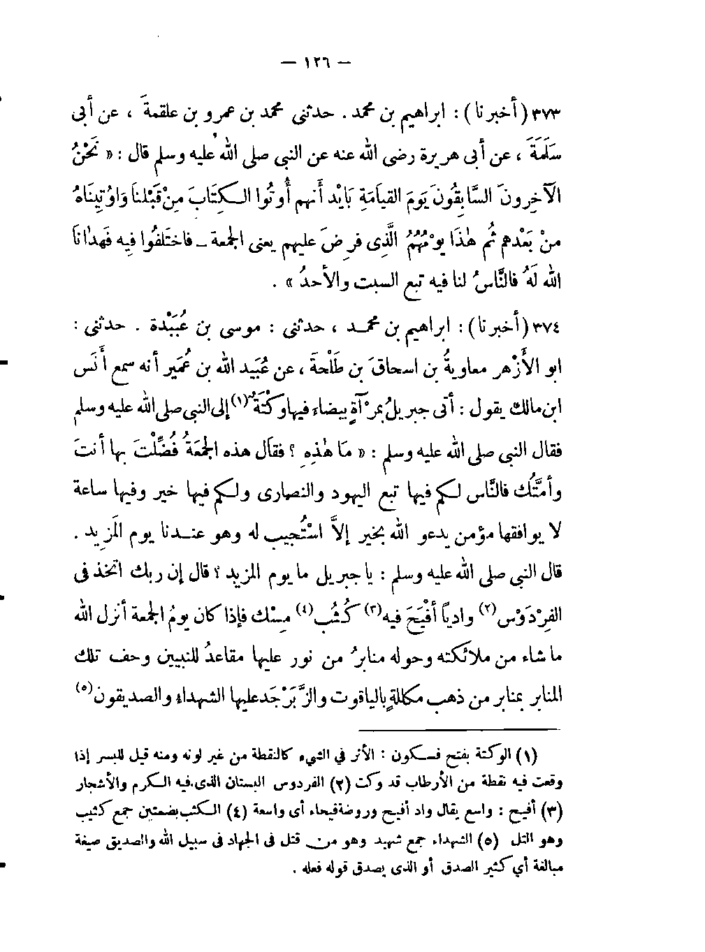 -أنه سمع أنَس ابن مالك يقول: أتى جبريلُ بمرْآةٍ بيضاءَ فيها وكْتَهٌ (الوكتة بفتح فسكون: الأثر في الشئ كالنقطة من غير لونه ومنه قيل للبسر إذا وقعت فيه نقطة من الأرطاب قد وكت) إلى النبي صلى اللَّه عليه وسلم فقال النبي صلى اللَّه عليه وسلم: مَاهذِهِ؟ فقَال هذه الجمعَةُ فُضِّلْتَ بها أنتَ وأمتَّك فالنَّاس لكم فيها تبع اليهود والنصارى ولكم فيها خير وفيها ساعة لا يوافقها مؤمن يدعوا اللَّه بخير إلا اسْتُجيب له وهو عندنا يوم المَزِيد. قال النبي صلى اللَّه عليه وسلم يا جبيرل ما يوم المزيد؟ قال إن ربك إتخذ في الفِرْدَوس (الفردوس البستان الذي فيه الكرم والأشجار) وادياً أفْيَحَ فيه (أفيح: واسع يقال واد أفيح وروضة فيحاء أي واسعة) كُثُب (الكثب بضمتين جمع كثيب وهو التل) مِسْك فإذا كان يوم الجمعة أنزل اللَّه ما شاء من ملائكته وحوله منابرُ من نور عليها مقاعدُ للنبيين وحف تلك المنابر بمنابر من ذهب مكللةٍ بالياقوت والزَّبَرْجَد عليها الشهداءُ والصديقون -[127]- (الشهداء جمع شهيد وهو من قتل في الجهاد في سبيل اللَّه والصديق صيغة مبالغة أي كثير الصدق أو الذي يصدق قوله فعله) فجلسوا من ورائهم على تلك الكُثُب فيقول اللَّه لهم أناربكم وقد صدقتكم وعدى فاسألوني أُعْطِكم فيقولون ربنا نسألك رضوانك في قول قد رضيتُ عنكم ولكم عليّ ما تمنيتم ولَدَيَّ مَزيدٌ فهم يحبون يوم الجمعة لما يعطيهم فيه ربهُّم من الخير وهو اليومُ الذي استوى (استوى: بمعنى استولى قال الشاعر: