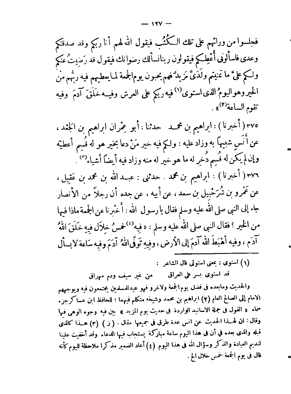 - شبيهاً به وزاد عليه: ولكم فيه خير مَنْ دعا بخير هو له قُسِم أعطيته وإن لم يكن له قُسِم دُخِر له ما هو خير له منه وزاد فيه أيضاً أشياء (هذا كالذي قبله والذي بعده في أن في هذا اليوم ساعة مباركة يستجاب فيها الدعاء وقد أخفيت علينا لنديم العبادة والذكر وسؤال اللَّه في هذا اليوم) .