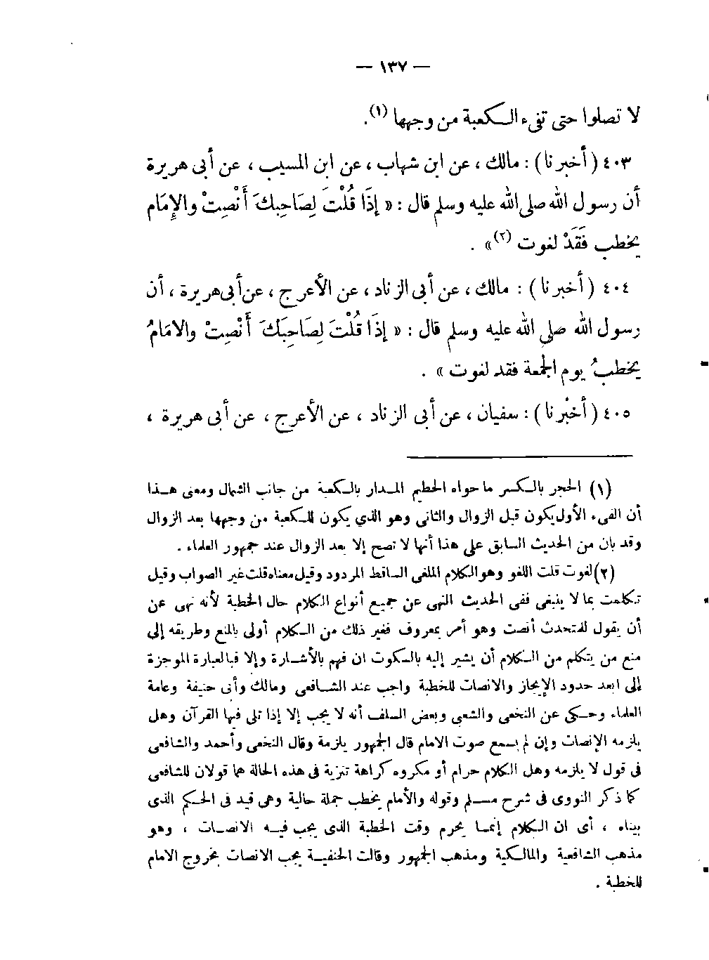 -أن رسول الله صلى اللَّه عليه وسلم قال: «إذَا قُلْتَ لِصَاحِبكَ أَنْصِتْ والإِمَام يخطب فقدْ لغوت (لغوت قلت اللغو وهو الكلام الملغى الساقط المردود وقيل معناه قلت غير الصواب وقيل تكلمت بما لا ينبغي ففي الحديث النهي عن جميع أنواع الكلام حال الخطبة لأنه نهي عن أن يقول للمتحدث أنصت وهو أمر بمعروف فغير ذلك من الكلام أولى بالمنع وطريقه إلى منع من يتكلم من الكلام أن يشير إليه بالسكوت إن فهم بالإشارة وإلا فبالعبارة الموجزة إلى أبعد حدود الإيجاز والإنصات للخطبة واجب عند الشافعي ومالك وأبي حنيفة وعامة العلماء وحكى عن النخعي والشعبي وبعض السلف أنه لا يجب إلا إذا تلى فيها القرآن وهل يلزمه الإنصات وإن لم يسمع صوت الإمام قال الجمهور يلزمه وقال النخعي وأحمد والشافعي في قول لا يلزمه وهل الكلام حرام أو مكروه كراهة تنزيه في هذه الحالة هما قولان للشافعي كما ذكر النووي في شرح مسلم وقوله والإمام يخطب جملة حالية وهي قيد في الحكم الذي بيناه أي أن الكلام إنما يحرم وقت الخطبة الذي يجب فيه الإنصات وهو مذهب الشافعية والمالكية ومذهب الجمهور وقالت الحنفية يجب الإنصات بخروج الإمام للخطبة) » .