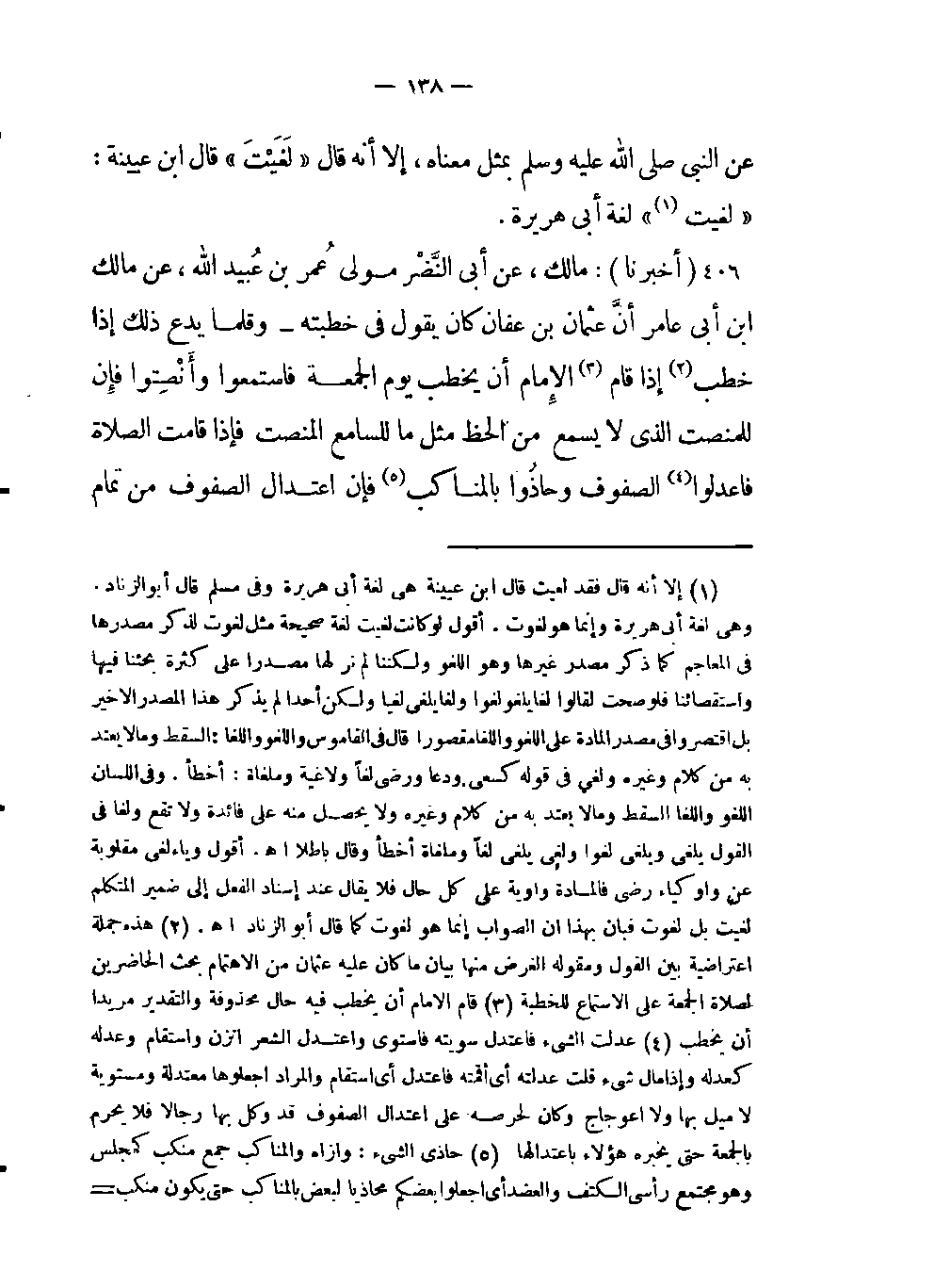 - أنَّ عثمان بن عفان كان يقول في خطبته وقلما يدع ذلك إذا خطب (هذه جملة إعتراضية بين القول ومقوله الغرض منها بيان ما كان عليه عثمان من الإهتمام بحث الحاضرين لصلاة الجمعة على الاستماع للخطبة) إذا قام (قام الإمام أن يخطب فيه حال محذوفة والتقدير مريدا أن يخطب) الإمام أن يخطب يوم الجمعة فاستمعوا وأنْصِتوا فإِن للمنصت الذي لا يسمع من الحظ مثل ما للسامع المنصت فإذا قامت الصلاة فاعدلوا (عدلت الشئ فاعتدل سويته فاستوى واعتدل الشعر اتزن واستقام وعدله كعدله وإذا مال شئ قلت عدلته أي أقمته فاعتدل أي استقام والمراد اجعلوها معتدلة ومستوية لا ميل بها ولا اعوجاج وكان لحرصه على اعتدال الصفوف قد وكل بها رجالا فلا يحرم بالجمعة حتى يخبره هؤلاء باعتدالها) الصفوف وحاذُوا بالمناكب (حاذى الشئ: وازاه والمناكب جمع منكب كمجلس وهو مجتمع رأسي الكتف والعضد أي اجعلوا بعضكم محاذيا لبعض بالمناكب حتى يكون منكب كل واحد موازيا لمنكب جاره لا خارجا عنه ولا داخلا وبذا تتحقق تسوية الصفوف المنشودة) فإن إعتدال الصفوف من تمام -[139]- الصلاة ثم لا يُكَبّر عثمان حتى يأتيه رجال قد وكلهم بتسوية الصفوف فيخبرونه بأن قد استوت فيكبر.