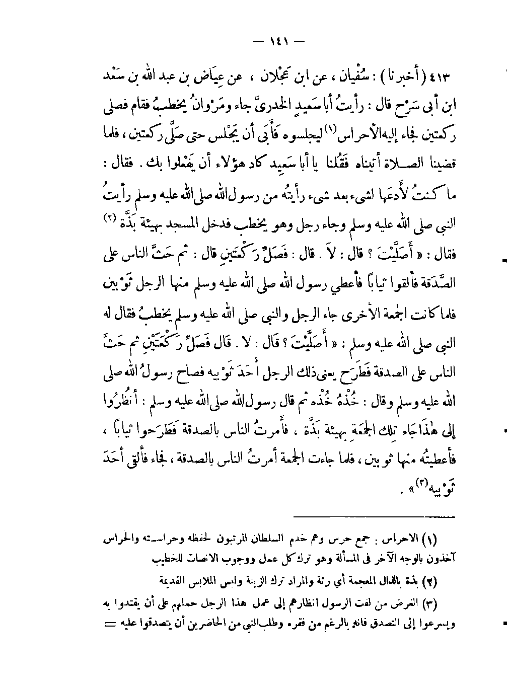 الملابس القديمة) فقال: " أصَلَّيْتَ؟ قالَ: لاَ قَالَ: فَصَلِّ ركعتين قال ثم حثَّ النَّاس على الصَّدقة فألقوا ثياباً فأعطي رسول اللَّه صلى اللَّه عليه وسلم منها الرجل ثَوْبين فلما كانت الجمعة الآخرى جاء رجل والنبي صلى اللَّه عليه وسلم يخطبُ فقال له النبي صلى اللَّه عليه وسلم: " أصَلَّيْتَ؟ قالَ: لاَ قَالَ: فَصَلِّ ركعتين قال ثم حثَّ النَّاس على الصَّدقة فَطَرَح يعني ذلك الرجل أحَدَ ثَوْبيه فصاح رسول اللَّه صلى اللَّه عليه وسلم وقال: خُذْهُ خُذْهُ ثم قال رسول اللَّه صلى اللَّه عليه وسلم: أنظُرُوا إلى هذَا جاء تِلك الجمعة بِهيئة بَذَّة، فأمرتُ الناس بالصدقة فَطَرَحوا ثياباً، فأعطيته منها ثوبين، فلما جاءت الجمعة أمرتُ الناس بالصدقة، فجاء فألقى أحَدَ ثَوْبيه -[142]- (الغرض من لفت الرسول أنظارهم إلى عمل هذا الرجل حملهم على أن يقتدوا به ويسرعوا إلى التصدق فإنه بالرغم من فقره وطلب النبي من الحاضرين أن يتصدقوا عليه بادر بالتصدق بأحد الثوبين اللذين تصدق بهما عليه ولا شك أنها اريحية وعاطفة دينية تستحق الإعجاب والثناء) ".