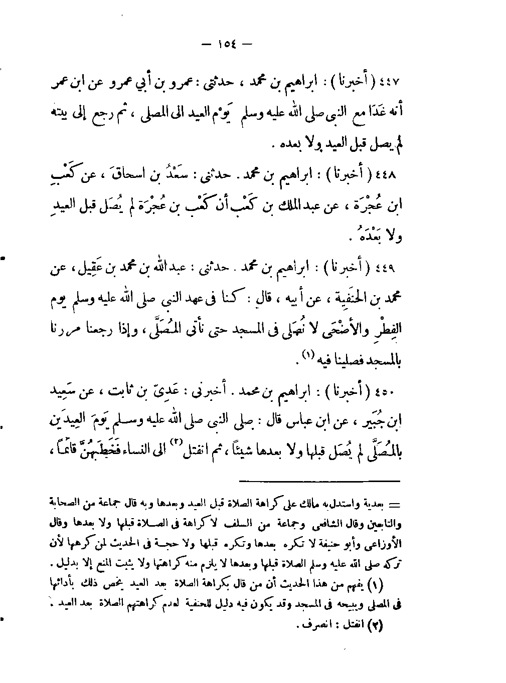 -كنا في عهد النبي صلى اللَّه عليه وسلم يوم الفِطْرِ والأضْحَى لا نُصَلي في المسجد حتى نأتي المُصَلَّى، وإذا رجعنا مررنا بالمسجد فصلينا فيه (يفهم من هذا الحديث أن من قال بكراهة الصلاة بعد العيد يخص ذلك بأدائها في المصلى ويبيحه في المسجد وقد يكون فيه دليل للحنفية لعدم كراهتهم الصلاة بعد العيد) .