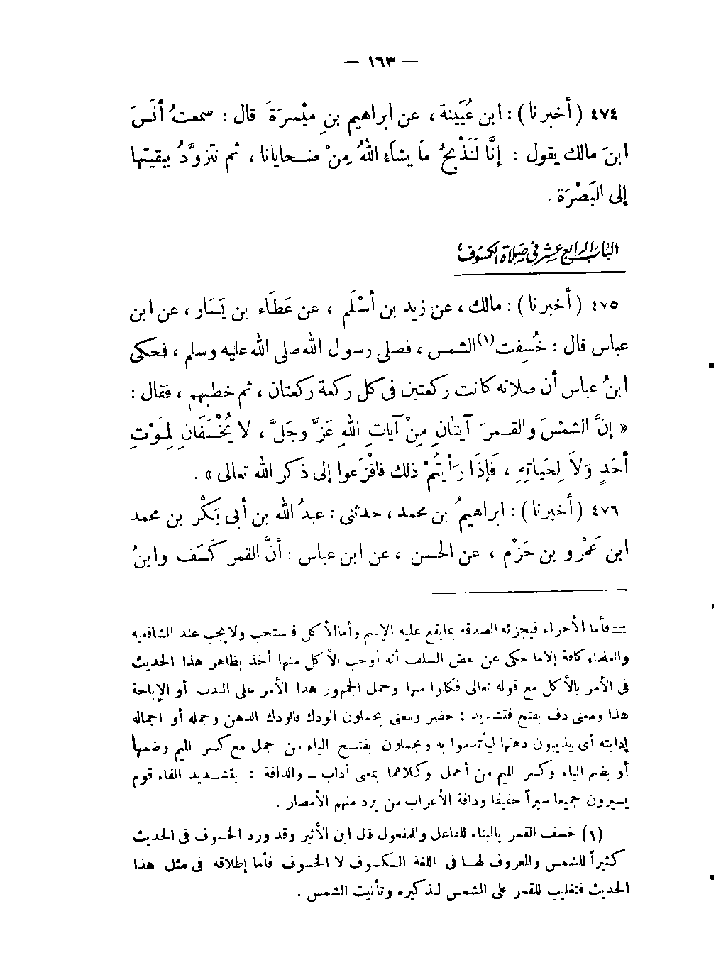 -أنَّ القمر كَسَف وابنُ -[164]- عباس بالبصرة فخرج ابن عباس فصلى بنا ركعتين في كل ركعة ركعتان ثم ركب فَخَطَبَنا فقال: إنما صليتُ كما رأيت رسول اللَّه صلى اللَّه عليه وسلم يصلي وقال: إنما الشمسُ والقمرُ آياتان من آيات اللَّه لا يُخْسَفَانِ لِمَوْتِ أحَدٍ وَلاَ لِحَيَاتِهِ، فإذا رَأيتُمْ شيئاً منها كاسفاً فليكُن فَزَعُكم إلى ذكر اللَّه عزوجل (فيه وفيما قبله وبعده بيان صلاة الكسوف والخسوف وإنها ركعتان في كل ركعة ركعتان على خلاف المعهود في الصلوات الأخرى وفي آخر الباب أنها ركعتان فيكل ركعة ثلاث ركعات وذكر مسلم رواية عن عائشة وعن ابن عباس وعن جابر ركعتين في كل ركعة ثلاث ركعات قال الحافظ والروايات الأول أصح ورواتها أحفظ وأضبط وقال جماعة أن منشأ اختلاف هذه الروايات اختلاف حل الكسوف وتأخر انجلائه طويلاً أو قصيراً وأجمع العلماء على أنها سنة ويسن أداؤها جماعة عند الجمهور ومالك والشافعي وأحمد وقال العراقيون فرادى والذي عليه الجمهور في صفتها أنها ركعتان في كل ركعة ركعتان وسجدتان في كل ركعة سواء طال الكسوف أم قصر بذلك قال الجمهور ومنهم مالك والليث وأحمد وقيل الحنفية ركعتان في كل ركعة ركوع واحد وسجودان كالمعتاد عملا بأحاديث أخر وإنما نبههم الرسول إلى أن الخسوف والكسوف آيتان من آيات اللَّه لأنهم كما سيأتي زعموا أن الشمس لما كسفت يوم موت إبراهيم ابنه صلى اللَّه عليه وسلم إنها كسفت لموته فأراهم خطأهم في ذلك وقال إنهما لا يخسفان لموت أحد كائنا من كان وإنما هما آيتان يخوف اللَّه بهما عباده فينبغي الرجوع إليه سبحانه والضراعة إليه أن يكشف اللَّه ما حل بهما في مثل هذه الأوقات وقوله خطبنا تشعرنا بأن الخطبة سنة في هذه الصلاة) «.