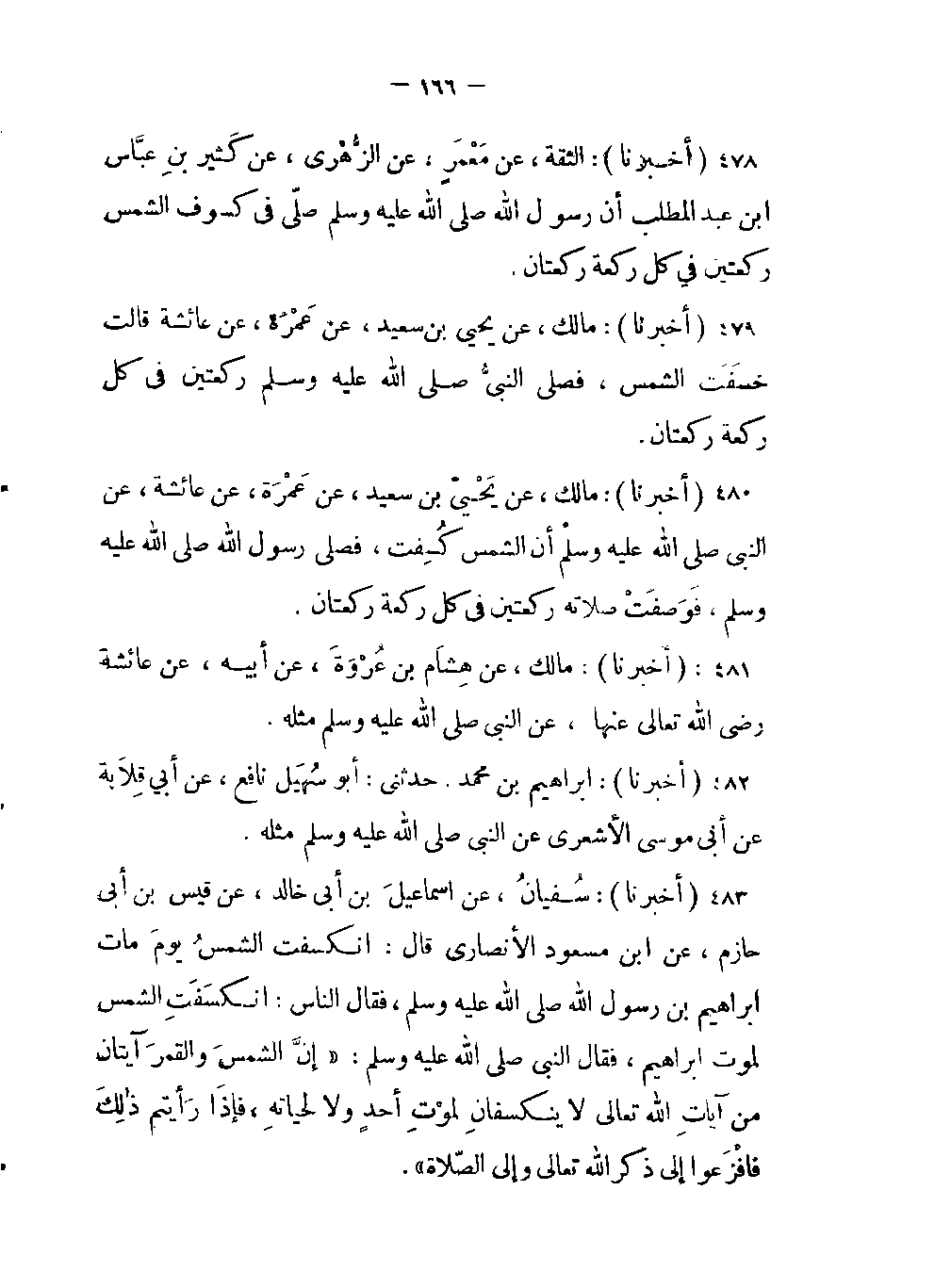 -عن النبُّي صلى اللَّه عليه وسلم أن الشمس كُسِفَت، فصلى رسول اللَّه صلى اللَّه عليه وسلم، فَوَصَفَتْ صلاته ركعتين في كل ركعة ركعتان.