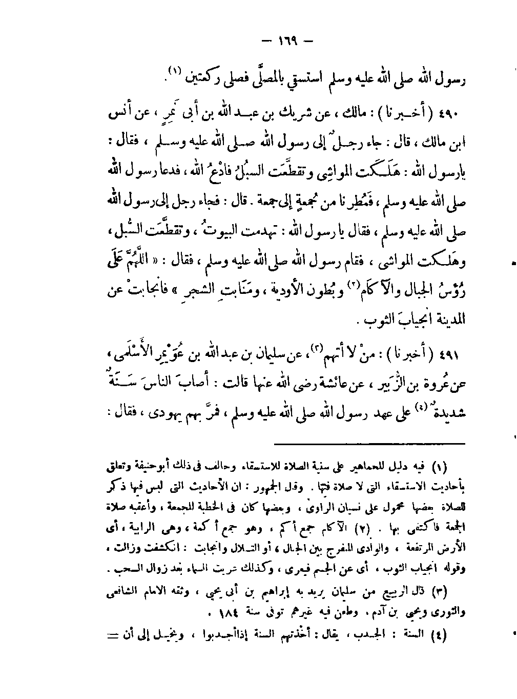 -جاء رجلٌ إلى رسول اللَّه صلى اللَّه عليه وسلم فقال: يا رسول اللَّه هَلَكَت المواشِي وتقطَّعَت السُبُل فادْعُ اللَّه فدعا رسول اللَّه صلى اللَّه عليه وسلم فَمُطِرنا من جُمعةٍ إلى جمعة قال: فجاء رجل إلى رسول اللَّه صلى اللَّه عليه وسلم فقال يا رسول اللَّه: تهدمت البيوتُ وتقطَّعَت السُّبل وهَلكت المواشي فقام رسول اللَّه صلى اللَّه عليه وسلم فقال: «اللَّهُمَّ عَلَى رُؤسُ الجبال والآكَام (الآكام جمع أكم وهو جمع أكمة وهي الرابية أي الأرض المرتفعة والوادي المفرج بين الجبال أو التلال وانجابت انكشفت وزالت وقوله انجياب الثوب أي عن الجسم فيعرى وكذلك عريت السماء بعد زوال السحب) وبُطون الأودية ومَنَابت الشجرِ» فانجابتْ عن المدينة انجيابَ الثوب.