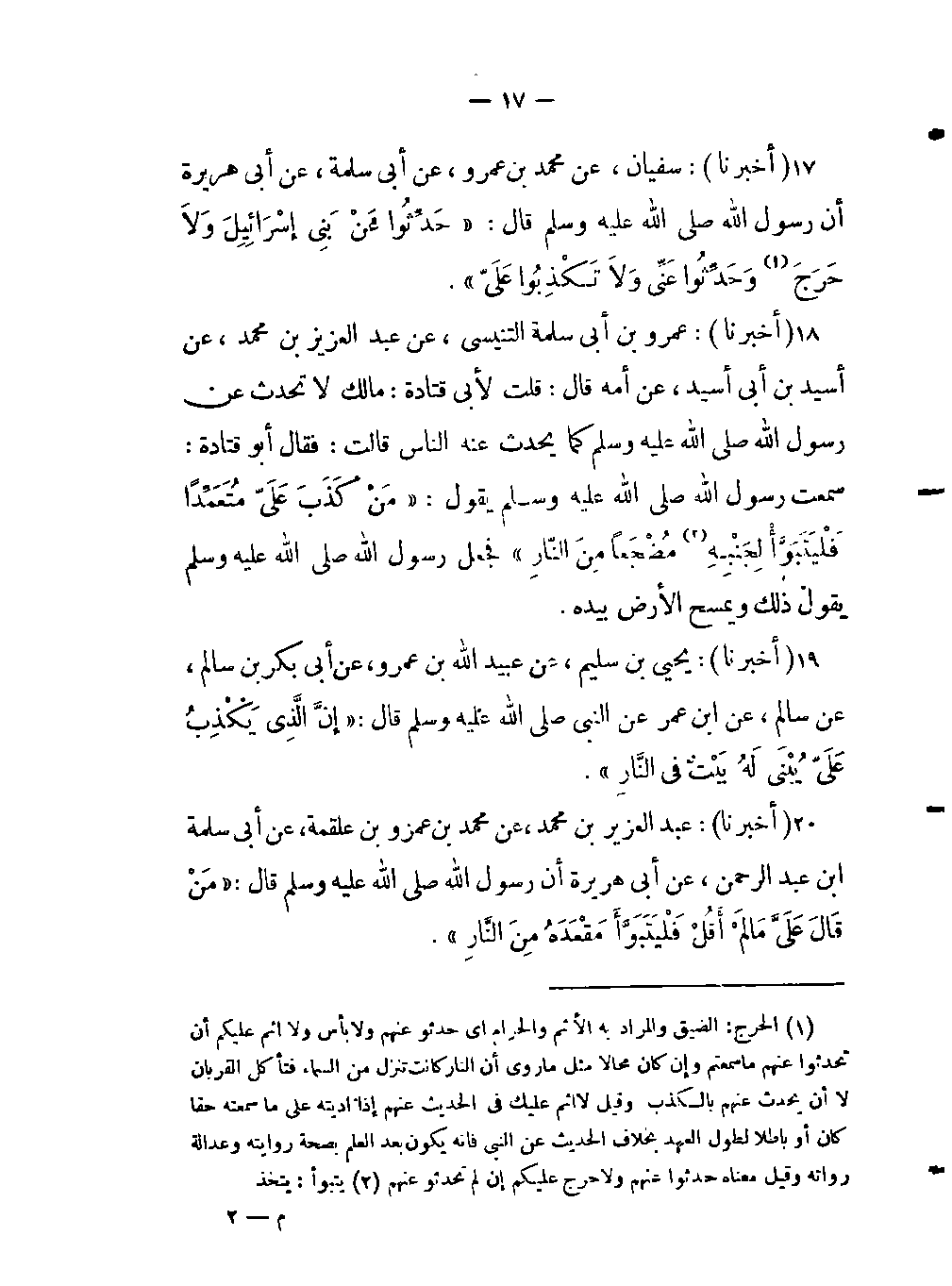 - أن رسول اللَّه صلى اللَّه عليه وسلم قال: «حَدِّثُوا عَنْ بَنِي إِسْرَائِيلَ ولاَ حَرَجَ (الضيق والمراد به الأثم والحرام أي حدثوا عنهم ولا بأس ولا اثم عليكم أن تحدثوا عنهم ما سمعتم وإن كان محالا مثل ما روى أن النار كانت تنزل من السماء فتأكل القربان لا أن يحدث عنهم بالكذب وقيل لا اثم عليك في الحديث عنهم إذا اديته على ما سمعته حقا كان أو باطلا لطول العهد بخلاف الحديث عن النبي فانه يكون بعد العلم بصحة روايته وعدالة رواته وقيل معناه حدثوا عنهم ولا حرج عليكم ان لم تحدثوا عنهم) وحَدِثُوا عَنِّي ولاَ تَكْذِبُوا عَلَيّ.»