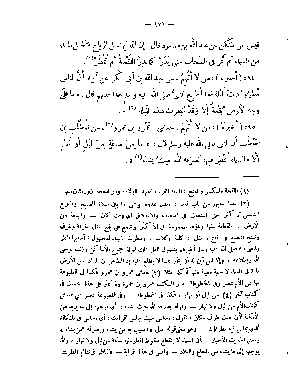 -أن النبي صلى اللَّه عليه وسلم قال: "مَا مِنْ سَاعَةٍ مِنْ لَيْلٍ أو نَهارٍ إلاَّ والسماءُ تُمْطِر فيها يُصَرفه اللَّه حيثُ يشاء -[172]- (من ليل أو نهار هكذا في المخطوطة وفي المطبوعة بمصر على هامش كتاب الأم من ليل ولا نهار وقوله يصرفه اللَّه حيث يشاء: أي يوجهه إلى ما يريد من الأمكنة لأن حيث ظرف مكان تقول: اجلس حيث جلس اقرانك: أي اجلس في المكان الذي يجلس فيه نظراؤك وهو معنى قوله تعالى «فيصيب به من يشاء ويصرفه عمن يشاء» ومعنى الحديث الإخبار بأن السماء لا ينقطع سقوط المطر منها ساعة من ليل ولا نهار واللَّه يوجهه إلى ما يشاء من البقاع والبلاد وليس في هذا غرابة فالناظر في نظام المطر يرى أقطارا تمطر صيفاً وثانية شتاء وثالثة دائما هذا وأماكن الأرض ليست كلها معروفة لنا ومازال الباحثون يكشفون منها الجديد عاما بعد فعاماً وقد خلق اللَّه الخلق وكفل لهم الرزق وأهم أسبابه المطر الذي ينبت الزرع الذي يعيش عليه الحيوان والإنسان فسبحانه من إله خبير ومدبر حكيم) .