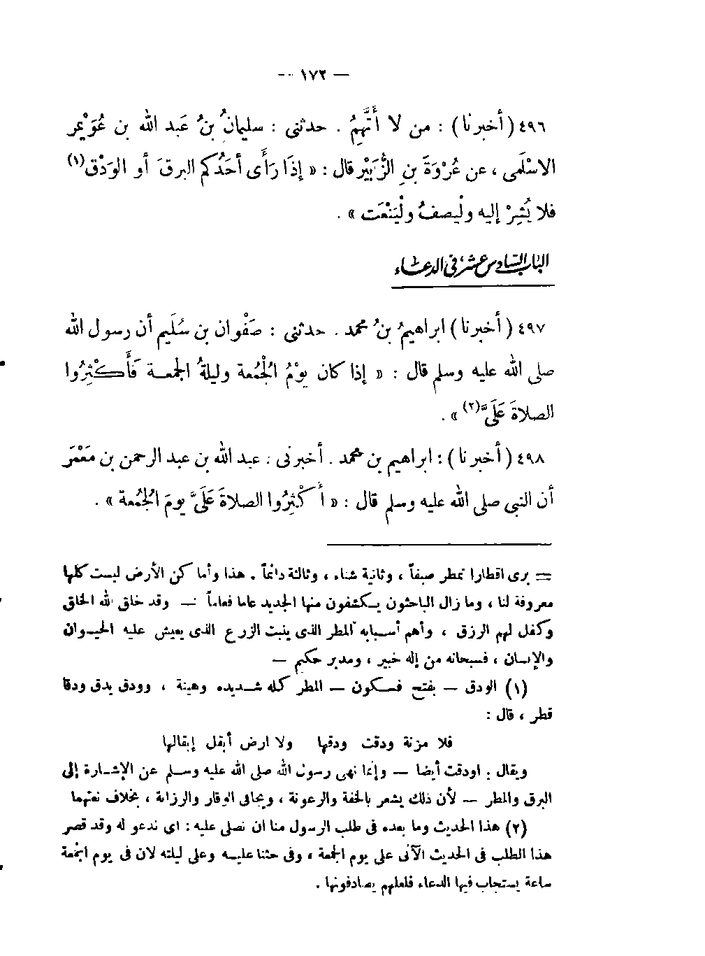 496- (أخبرنا) : من لا أَتَّهِمُ حدثني: سليمانُ بنُ عَبد اللَّه بن عُوَيْمر الأسْلَمي عن عُرْوَةَ بنِ الزُّبَيْر قال: "إذَا رَأَى أحَدُكم البرقَ أو الوَدْقَ (الودق بفتح فسكون المطر كله شديده وهينه وودق يدق ودقا قطر قال: