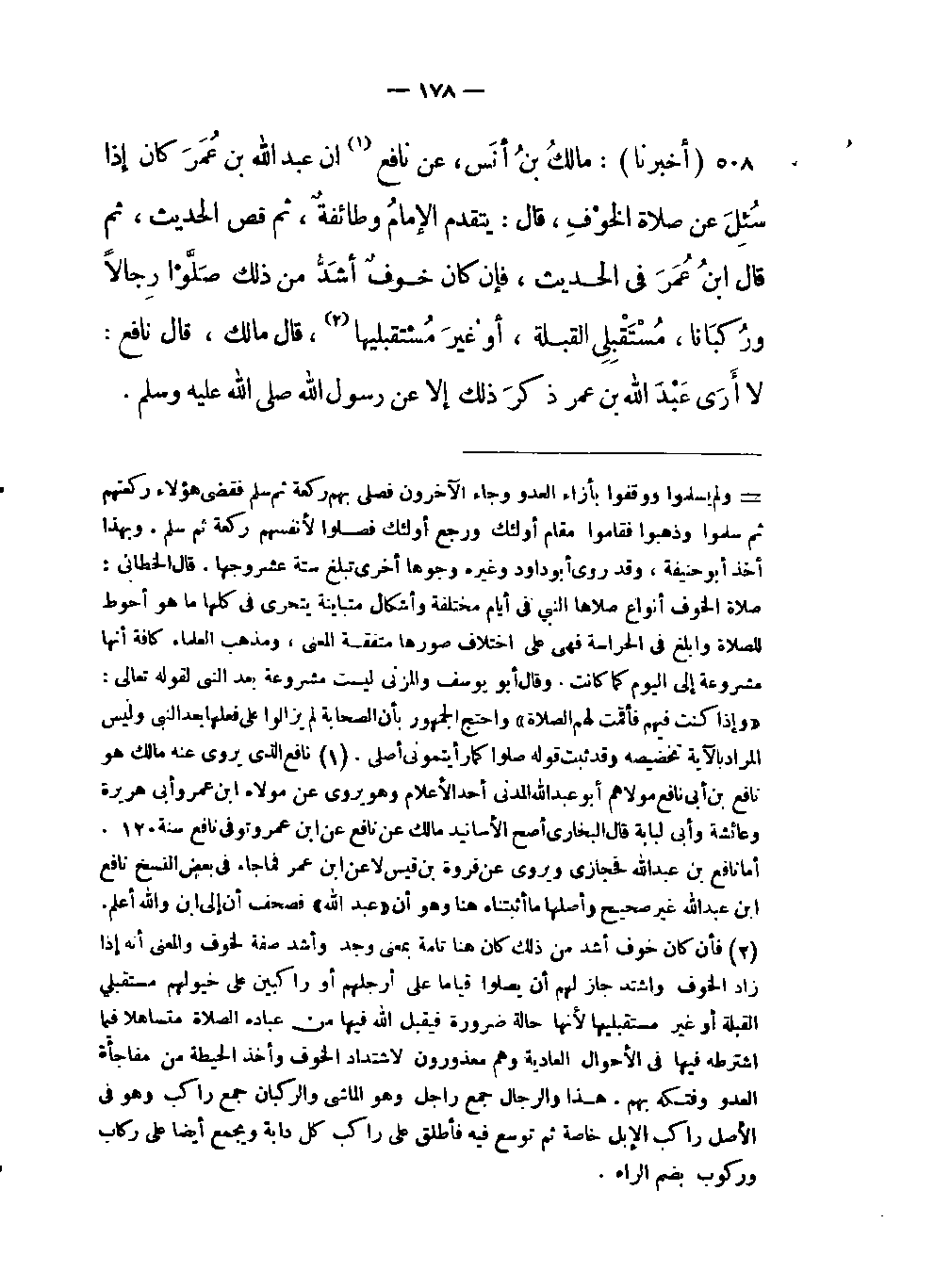 508- (أخبرنا) : مالكُ بنُ أنَس عن نافع (نافع الذي يروي عنه مالك هو نافع بن أبي نافع مولاهم أبو عبد الله المدني أحد الأعلام وهو يروي عن مولاه ابن عمر وأبي هريرة وعائشة وأبي لبابة قال البخاري أصح الأسانيد مالك عن نافع عن ابن عمرو توفي نافع سنة 120 أما نافع بن عبد اللَّه فحجازي ويروي عن فروة بن قيس لا عن ابن عمر فما جاء في بعض النسخ نافع ابن عبد اللَّه غير صحيح وأصلها ما أثبتناه هنا وهو أن «عبد اللَّه» فصحف أن إلى ابن واللَّه أعلم) أن عبد اللَّه بن عُمَرَ كان إذا سُئِلَ عن صلاة الْخَوْفِ قال: يتقدم الإمامُ وطائفةٌ ثم قص الحديث ثم قال ابنُ عُمَرَ في الحديث فإن كان خوفٌ أشَدُّ من ذلك صَلَّوْا رِجالاً ورُكْبَانا مُسْتَقْبِلِي القبلة أو غيرَ مُسْتَقْبِلِيها (فإن كان خوف أشدمن ذك كان هنا تامة بمعنى وجد وأشتد جاز لهم أن يصلوا قياما على أرجلهم أو راكبين على خيولهم مستقبلي القبلة أو غير مستقبليها لأنها حالة ضرورة فيقبل اللَّه فيها من عباده الصلاة متساهلا فيما اشترط فيها في الأحوال العادية وهم معذورون لإشتداد الخوف وأخذ الحيطة من مفاجأة العدو وفتكه بهم هذا والرجال جمع راجل وهو الماشي والركبان جمع راكب وهو في الأصل راكب الإبل خاصة ثم توسع فيه فأطلق على راكب كل دابة ويجمع أيضا على ركاب وركوب بضم الراء) قال مالك قال نافع: لا أَرَى عَبْدَ اللَّه بن عمر ذكرَ ذلك إلا عن رسول اللَّه صلى اللَّه عليه وسلم.