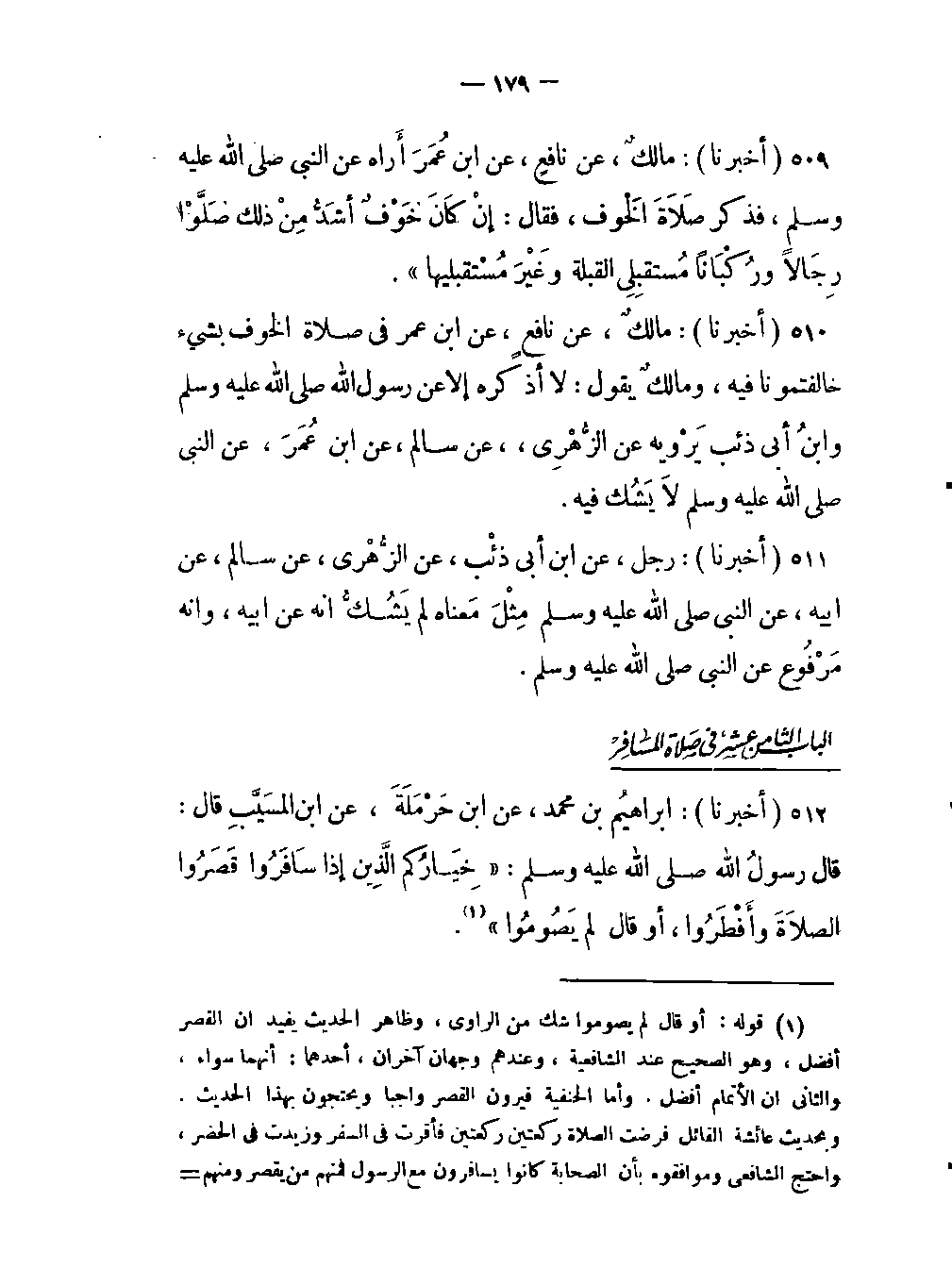 510- (أخبرنا) : مالكٌ، عن نافعٍ عن ابن عُمَرَ في صلاة الخوف بشئ خالفتمونا فيه ومالكٌ يقول: