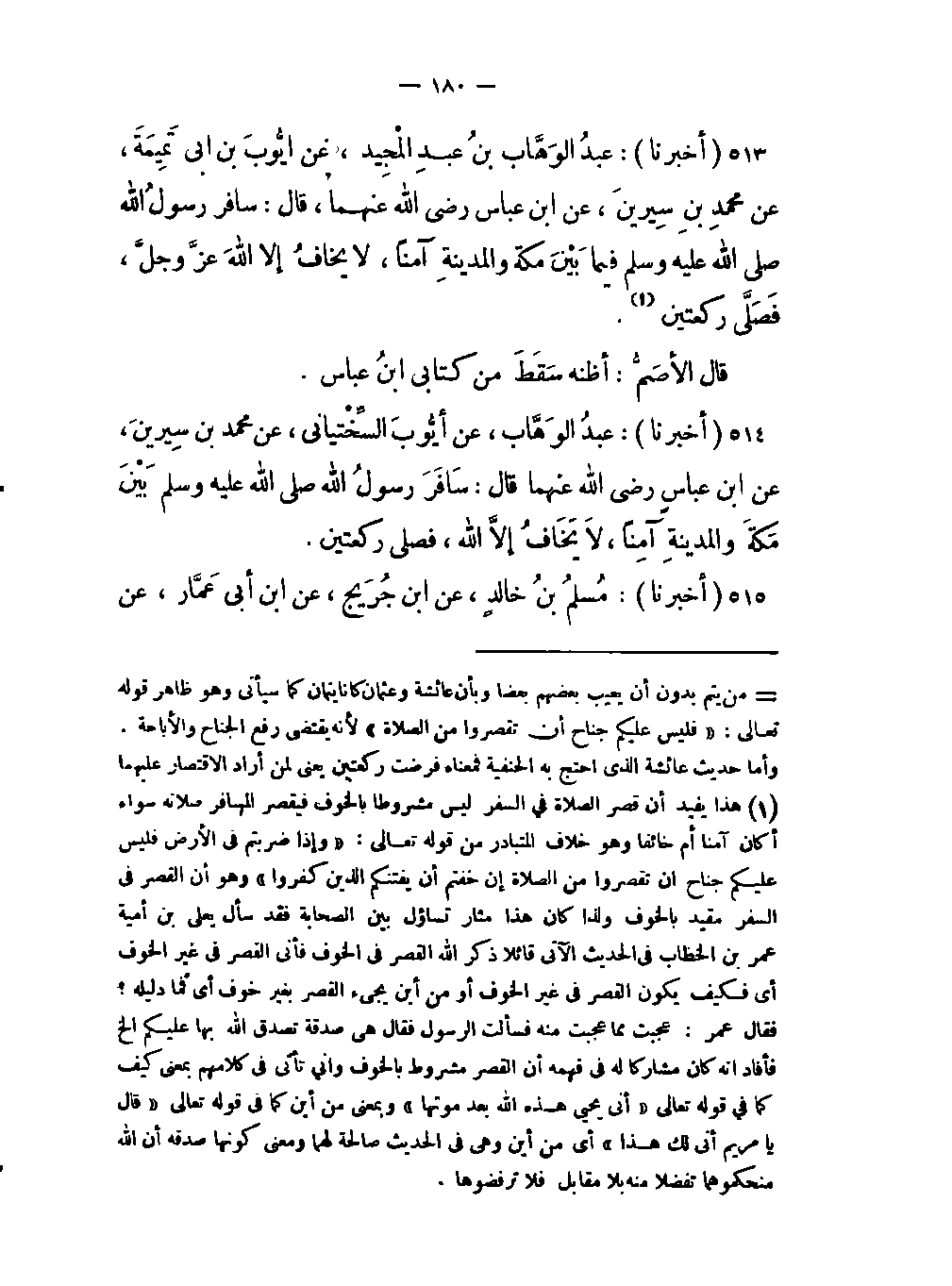-سافر رسول اللَّه صلى اللَّه عليه وسلم فيما بَيْنَ مكة والمدينةِ آمناً لا يخافُ إلا اللَّه عزَّوجلَّ فَصَلَّى ركعتين (هذا يفيد أن قصر الصلاة في السفر ليس مشروطا بالخوف فيقصر المسافر صلاته سواء أكان آمنا أم خائفا وهو خلاف المتبادر من قوله تعالى: «وإذا ضربتم في الأرض فليس عليكم جناح أن تقصروا من الصلاة إن خفتم أن يفتنكم الذين كفروا» وهو أن القصر في السفر مقيد بالخوف ولذا كان هذا مثار تساؤل بين الصحابة فقد سأل يعلى بن أمية عمر بن الخطاب في الحديث الآتي قائلا ذكر اللَّه القصر في الخوف فأنى القصر في غير الخوف أي فكيف يكون القصر في غير الخوف أو من أين يجئ القصر بغير خوف أي فما دليله فقال عمر: عجبت مماعجبت منه فسألت الرسول فقال هي صدقة تصدق اللَّه بها عليكم إلخ فأفاد أنه كان مشاركا له في فهمه أن القصر مشروط بالخوف وأنى تأتي في كلامهم بمعنى كيف كما في قوله تعالى «أنى يحي هذه اللَّه بعد موتها» وبمعنى من أين كما في قوله تعالى «قال يا مريم أنى لك هذا» أي من أين وهي في الحديث صالحة لهما ومعنى كونها صدقة أن اللَّه منحكموهما تفضلا منه بلا مقابل فلا ترفضوها) .