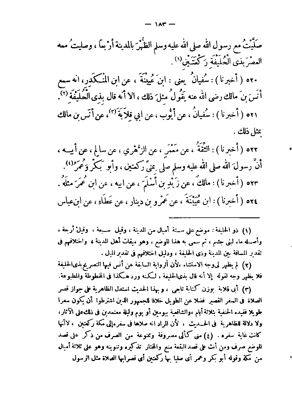 521- (أخبرنا) : سُفيانُ عن أيُّوب عن أبي قِلاَبَةَ (أبي قلابة بوزن كتابة تابعي وبهذا الحديث استدل الظاهرية على جواز قصر الصلاة في السفر القصير فضلا عن الطويل خلافا للجمهور الذين اشترطوا أن يكون سفراً طويلاً فقيده الحنفية بثلاثة أيام والشافعية بيومين أو يوم وليلة معتمدين في ذلك على الأثار ولا دلالة للظاهرية في الحديث لأن المراد أنه صلاها في سفره إلى مكة ركعتين لا أنها كانت غاية سفره) عن أنَس بن مالك بمثل ذلك.