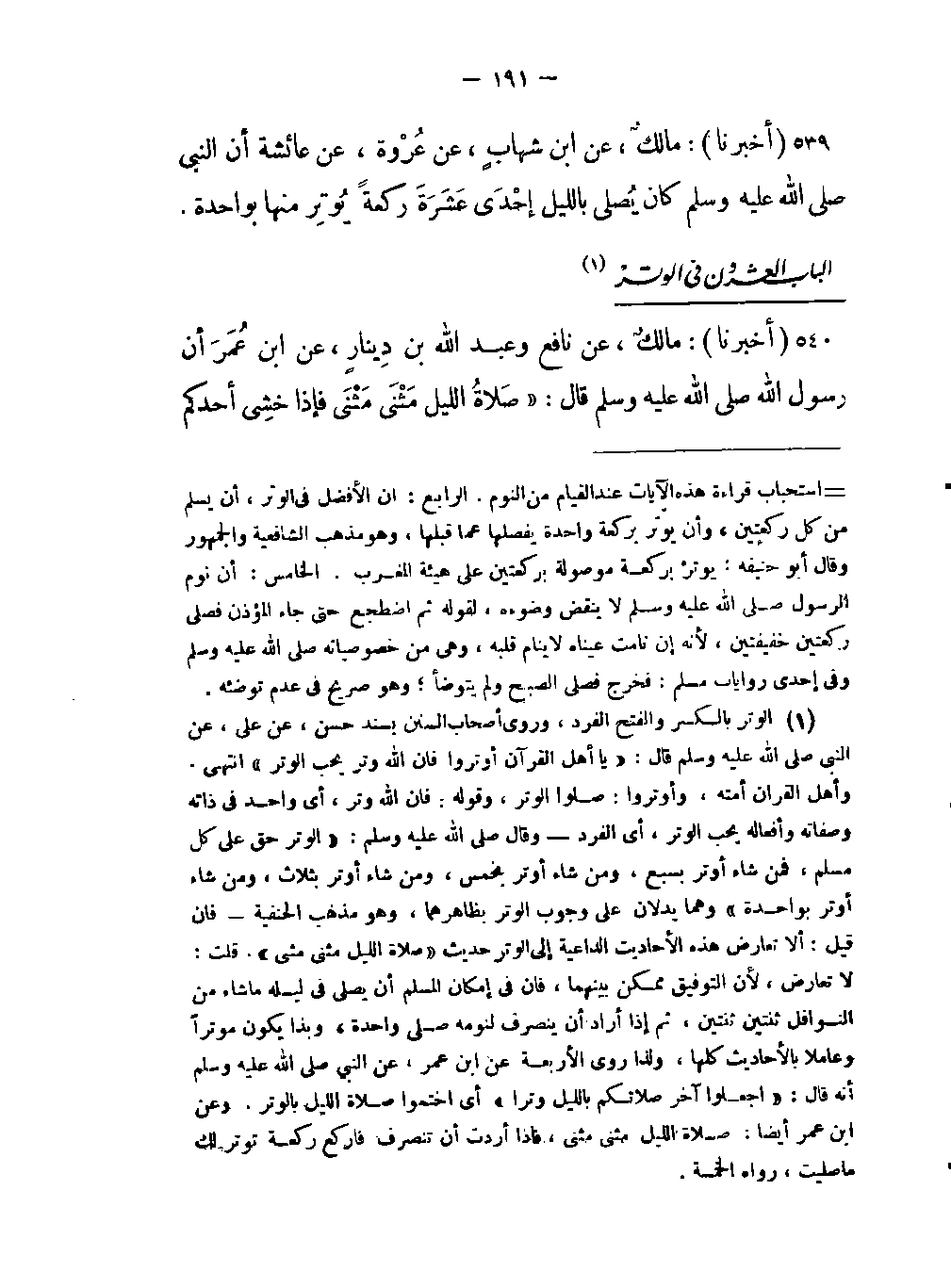 الباب العشرون في الوتر (الوتر بالكسر والفتح الفرد وروى أصحاب السنن بسند حسن عن علي عن النبي صلى اللَّه عليه وسلم قال: «يا أهل القرآن أوتروا فإن اللَّه وتر يحب الوتر» انتهى وأهل القرآن أمته وأوتروا: صلوا الوتر وقوله فإن اللَّه وتر أي واحد في ذاته وصفاته وأفعاله يحب الوتر أي الفرد وقال صلى اللَّه عليه وسلم: "الوتر حق على كل مسلم فمن شاء أوتر بسبع ومن شاء أوتر بخمس ومن شاء أوتر بثلاث ومن شاء أوتر بواحدة وهما يدلان على وجوب الوتر بظاهرهما وهو مذهب الحنفية فإن قيل: ألا تعارض هذه الأحاديث الداعية إلى الوتر حديث «صلاة الليل مثنى مثنى» قلت: لا تعارض لأن التوفيق ممكن بينهما فإن في إمكان المسلم أن يصلي في ليله ما شاء من النوافل ثنتين ثنتين ثم إذا أراد أن ينصرف لنومه صلى واحدة وبذا يكون موترا وعاملا بالأحاديث كلها ولذا روى الأربعة عن ابن عمر عن النبي صلى اللَّه عليه وسلم أنه قال: «اجعلوا آخر صلاتكم بالليل وترا» أي أختموا صلاة الليل بالوتر وعن ابن عمر أيضا: صلاة الليل مثنى مثنى فإذا أردت أن تنصرف فاركع ركعة توتر لك ما صليت رواه الخمسة) .