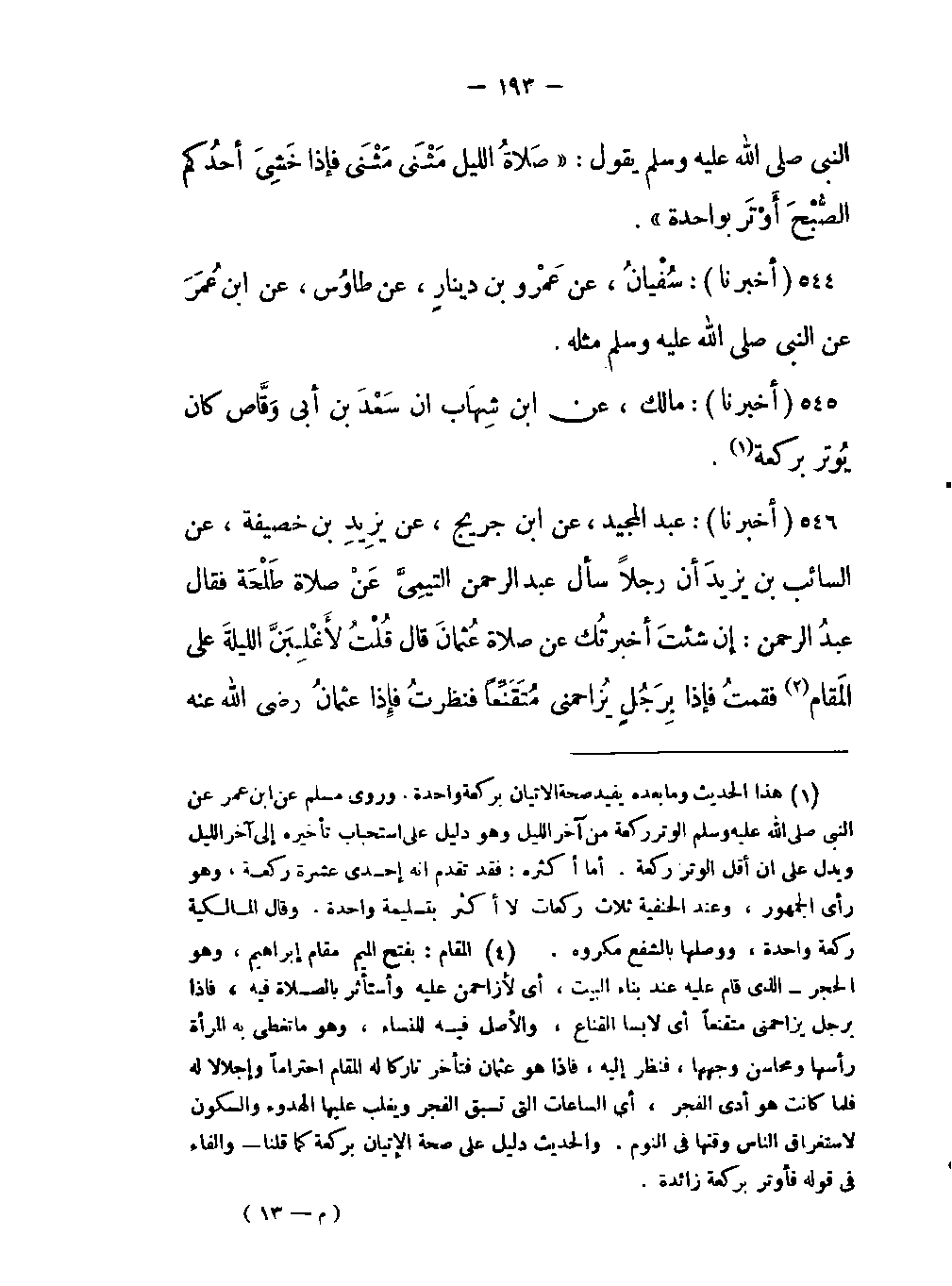 -أن رجلاً سأل عبد الرحمن التيمِيَّ عَنْ صلاة طَلْحَة فقال عبدُ الرحمن: إن شئت أخبرتُك عن صلاة عُثمانَ قال قُلْتُ لأَغْلِبَنَّ الليلةَ على المَقام (المقام بفتح الميم مقام إبراهيم وهو الحجر الذي قام عليه عند بناء البيت أي لأزاحمن عليه واستأثر بالصلاة فيه فإذا برجل يزاحمني متقنعاً أي لابسا القناع والأصل فيه للنساء وهو ما تغطي به المرأة رأسها ومحاسن وجهها فنظر إليه فإذا هو عثمان فتأخر تاركا له المقام إحتراما وإجلالاً له فلما كانت هو أدى الفجر أي الساعات التي تسبق الفجر ويغلب عليها الهدوء والسكون لاستغراق الناس وقتها في النوم والحديث دليل على صحة الإتيان بركعة كما قلنا والفاء في قوله فأوتر بركعة زائدة) فقمتُ فإذا بِرَجُلٍ يُزاحمني مُتَقَنِّعاً فنظرت فإذا عُثمانُ رضي اللَّه عنه -[194]- قال فتأخرتُ عنه فصلى فإذا هو سَجَد سُجودَ القرآن حتى إذا قلتُ هذه هَوَادي الفَجْر فأوْتَرَ بركعة لم يُصَلّ غيْرَها.