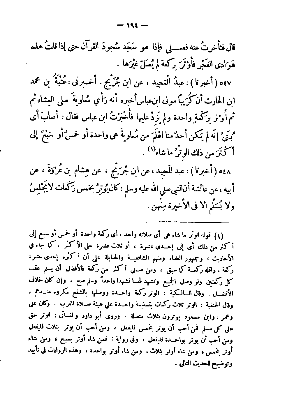 -أن كُرَيباً مولى ابن عباس أخبره أنه رَأَى مُعاويةَ صلى العِشَاءَ ثم أوْتر برَكْعةٍ واحدة ولم يَزِدْ عليها فأَخْبَرْتُ ابن عباس فقال: أصابَ أي بُنَيَّ إنه لم يَكن أحدٌ منا أعْلَمَ من مُعاويةَ هي واحدة أو خمسٌ أو سبعٌ إلى أَكْثَرَ من ذلك الوِتْرُ ما شاء (قوله الوتر ما شاء أي صلاته واحد أي ركعة واحدة أو خمس أو سبع إلى أكثر من ذلك أي إلى إحدى عشرة أو ثلاث عشرة على الأكثر كما جاء في الأحاديث وجمهور العلماء ومنهم الشافعية والحنابلة على أن أكثره إحدى عشرة ركعة وأقله ركعة كما سبق ومن صلى أكثر من ركعة فالأفضل أن يسلم عقب كل ركعتين ولو وصل الجميع وتشهد لها تشهدا واحداً وسلم صح وإن كان خلاف الأفضل وقال المالكية: الوتر ركعة واحدة ووصلها بالشفع مكروه عندهم وقال الحنفية: الوتر ثلاث ركعات بتسليمة واحدة على هيئة صلاة المغرب وكان علي وعمر وابن مسعود يوترون بثلاث متصلة وروى أبو داود والنسائي: الوتر حق على كل مسلم فمن أحب أن يوتر بخمس فليفعل ومن أحب أن يوتر بثلاث فليفعل ومن أحب أن يوتر بواحدة فليفعل وفي رواية: فمن شاء أوتر بسبع ومن شاء أوتر بخمس ومن شاء أوتر بثلاث ومن شاء أوتر بواحدة وهذه الروايات في تأييد وتوضيح للحديث التالي) .