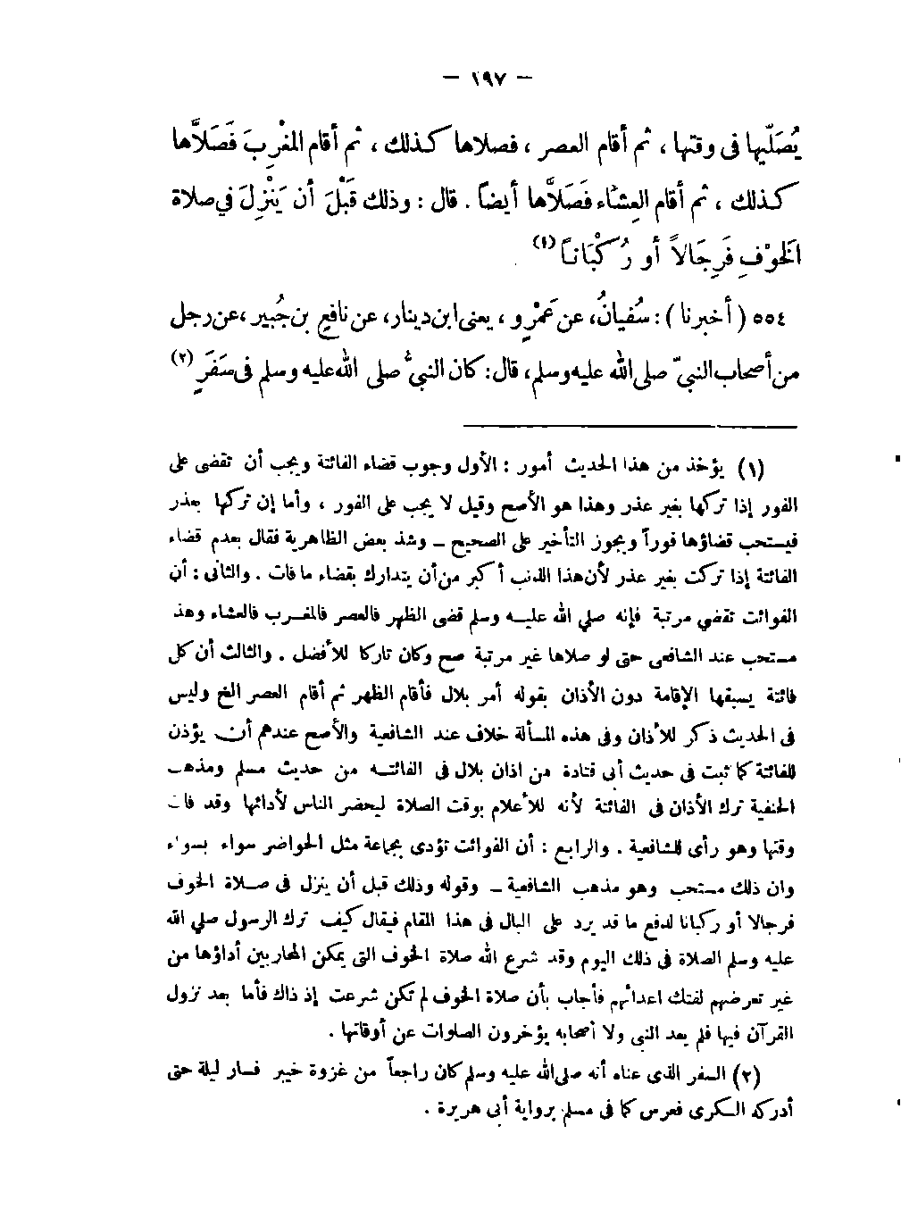 -كان النبي صلى اللَّه عليه وسلم في سَفَرٍ -[198]- (السفر الذي عناه أنه صلى اللَّه عليه وسلم كان راجعاً من غزوة خيبر فسار ليلة حتى أدركه الكرى فعرس كما في مسلم برواية أبي هريرة) فَعَرَّسَ (قوله فعرس بالتشديد التعريس: نزول المسافر آخر الليل للنوم والاستراحة وقوله يكلؤنا أي يحرسنا ويحفظنا كلأه يكلؤه من باب نفع كلاءة وكلاء بالكسر فيهما وكلئا بالفتح: حفظه وحرسه) فقالَ: ألاَ رجلٌ صالحٌ يكلؤنا اللَّيْلَةَ فلا يَرْقُدُ عن الصلاة فقال بلالٌ: أنا يا رسولَ اللَّه قال: فاسْتَنَدَ بلالٌ إلى رَاحِلَتِهِ (الراحلة هي البعير القوي على الأسفار والأحمال الذكر والأنثى فيه سواء وهاؤه للمبالغة واستند إلى الشئ اعتمدعليه بظهر هو المعنى أن بلالا ركن ظهره إلى جمله قيل الفجر فغلبه النوم «فلم يفزعوا إلا بحر الشمس» أي فلم يهبوا وينتبهوا من نومهم إلا بحر الشمس أي بعد أن أحسوا بحرارتها على وجوههم يقال فزع بالكسر من نومه أي هب وانتبه وكأنه من الفزع بمعنى الخوف لأن الذي ينبه لا يخلوا من فزع ما وهنا يقال كيف غلب النوم الرسول وهو الذي لا ينام قلبه وإن نامت عيناه والجواب أن القلب إنما يدرك الحسيات المتعلقة به كخروج الريح مثلا فقد عللوا عدم انتقاض وضوئه بالنوم بأن قلبه لا ينام أي يشعر بهذه الحسية أما طلوع الفجر فلا يدرك بالقلب بل بالعين وهي نائمة وإن كان القلب يقظان) واسْتَقْبَلَ الفجرَ فلم يَفْزَعُوا إلاَّ بِحَرِّ الشَّمْسِ في وُجُوههم فقال رسولُ اللَّه صلى اللَّه عليه وسلم: يا بلالُ أين ما قلت؟ (أين ما قلت هذا الاستفهام في إحدى النسخ الخطية دون غيرها) فقال بلالٌ يا رسولَ اللَّه: أخَذَ بِنَفْسِي الذي بِنَفْسِك (فقال بلال أخذ بنفسي إلخ أي غلبني على نفسي ما غلبك وهو النوم يعتذر من عدم إيقاظهم كما وعد) قال: فتوضأ رسولُ اللَّه صلى اللَّه عليه وسلم ثمَّ صلى رَكْعتى الفَجْر ثم قالَ: اقتادوا شيئاً قالَ: ثمَّ صَلَّى الْفَجْرَ -[199]- (اقتادوا أي اقتادوا رواحلكم شيئا أي قليلا فهو نائب عن المفعول المطلق وفي مسلم قال اقتادوا فاقتادوا رواحلهم شيئا وهذا دليل على أن قضاء الفائتة بعذر لا يلزم أن يكون على الفور وإنما أمرهم باقتيادهم لما ذكره في مسلم من أن هذا منزل حضرهم فيه الشيطان وفي الحديث دليل على قضاء سنة الصبح فإنه صلاها أولا ثم انتقل قليلا ثم صلى الفجر وبهذا أخذ الحنفية فقالوا بقضاء سنة الفجر دون غيرها والصحيح عند الشافعية قضاء السنن الراتبة كلها لقوله صلى اللَّه عليه وسلم من نسي صلاة فليصلها إذا ذكرها والأحاديث أُخر كثيرة في الصحيح كقضائه سنة الظهر بعد العصر حين شغله عنها الوقد وغير ذلك) .