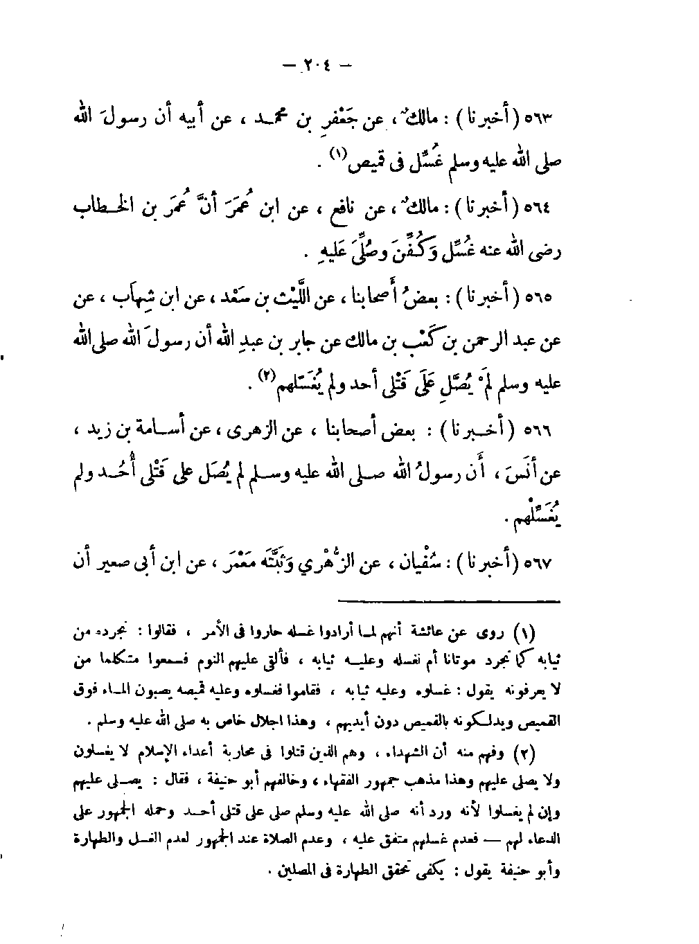-أن رسولَ اللَّه صلى اللَّه عليه وسلم لَمْ يُصَّلِ عَلَى قَتْلى أحد ولم يُغَسّلهم (وفهم منه أن الشهداء وهم الذين قتلوا في محاربة أعداء الإسلام لا يغسلون ولا يصلى عليهم وهذا مذهب جمهور الفقهاء وخالفهم أبو حنيفة فقال: يصلى عليهم وإن لم يغسلوا لأنه ورد أنه صلى اللَّه عليه وسلم صلى على قتلى أحد وحمله الجمهور على الدعاء لهم فعدم غسلهم متفق عليه وعدم الصلاة عند الجمهور لعدم الغسل والطهارة وأبو حنيفة يقول: يكفي تحقق الطهارة في المصلين) .