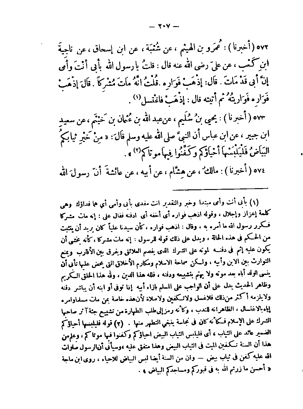 -قلتُ يا رسول اللَّه بأبي أنْتَ وأمي إنَّ أبي قَدْ مَاتَ قَال: إذْهَبْ فَوارِهِ قُلْتُ إنَّهُ مَاتَ مُشْرِكاً قَالَ إذْهَبْ فَوارِهِ فَوَاريتُهُ ثم أتيته قال: إذْهَبْ فاغْتسل (بأبي أنت وأمي مبتدا وخبر والتقدير أنت مفدى بأبي وأمي أي هما فداؤك وهي كلمة إعزاز وإجلال وقوله اذهب فواره أي أخفه أي أدفنه فقال علي: إنه مات مشركا فكرر رسول اللَّه ما أمره به وقال: اذهب فواره كأن سيدنا عليا كان يريد أن يتثبت من الحكم في هذه الحالة ويدل على ذلك قوله للرسول: إنه مات مشركا كأنه يخشى أن يكون عليه إثمفي دفنه لموته على الشرك الذي يفصم العلائق ويفرق بين الأقارب ويمنع التوارث بين الإبن وأبيه ولكن سماحة الإسلام ومكارم الأخلاق التي يحض عليها تأبى أن ينسى الولد أباه بعد موته ولا يهتم بتشييعه ودفنه فلله هذا الدين ولله هذا الخلق الكريم وظاهر الحديث يدل على أن الواجب على المسلم بإزاء أبيه إذا توفى أو ابنه أن يباشر دفنه ولا يلزمه أكثر من ذلك فلا غسل ولا تكفين ولا صلاة لأن هذه خاصة بمن مات مسلما وأمره إياه بالإغتسال الظاهر أنه للندب وكأنه رمز إلى طلب الطهارة من تشييع جثة آثر صاحبها الشرك على الإسلام فكأنه كان في نجاسة ينبغي التطهر منها) .