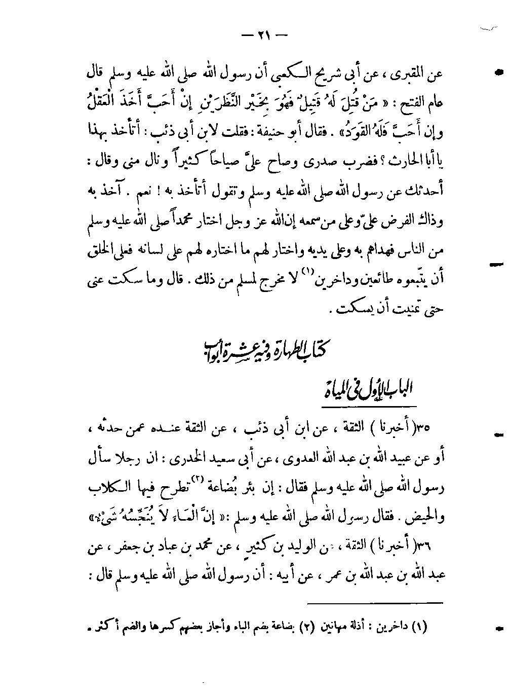 - أن رجلا سأل رسول اللَّه صلى اللَّه عليه وسلم فقال: إن بئر بُضاعة (بضاعة بضم الباء وأجاز بعضهم كسرها والضم أكثر) تطرح فيه الكلاب والحيض. فقال رسول اللَّه صلى اللَّه عليه وسلم: «إنَّ المَاءَ لاَ يُنَجِّسُهُ شَئٌ» .
