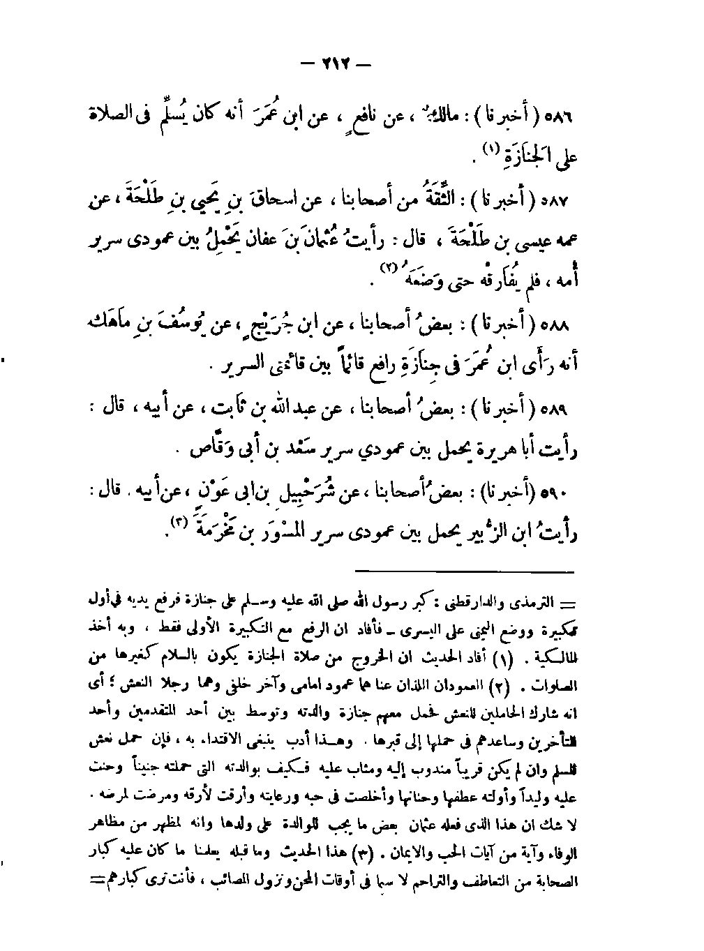 -رأيتُ ابن الزُّبير يحمل بين عمودي سرير المسْوَر بن مَخْرَمَةَ -[213]- (هذا الحديث وما قبله يعلمنا ما كان عليه الصحابة من التعاطف والتراحم لا سيما في أوقات المحن ونزول المصائب فأنت ترى كبارهم يتقدمون لمشاركة الحاملين للنعش يزاحمون ويتنافسون في ذلك البر الذي يجلب الثواب ورضا اللَّه والعباد ويفعل فعل السحر في بنفوس أهل المتوفي فينسيهم الأحقاد القديمة ويغرس في قلوبهم بذور المحب والوداد) .