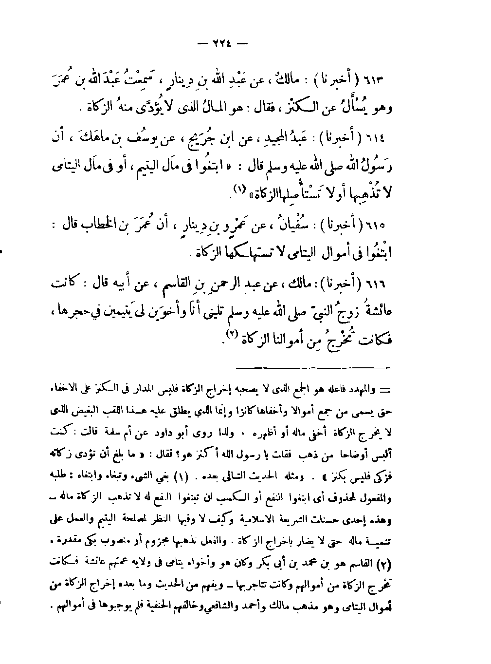 -كانت عائشة زوجُ النبي صلى اللَّه عليه وسلم تليني أنَا وأخوَين لي يَتيمين في حجرها فكانت تُخْرجُ مِن أموالنا الزكاة -[225]- (القاسم هو محمد بن أبي بكر وكان هو وأخواه يتامى في ولية عمتهم عائشة فكانت تخرج الزكاة من أموالهم وكانت تتاجر بها ويفهم من الحديث وما بعده إخراج الزكاة من أموال اليتامى وهو مذهب مالك وأحمد والشافعي وخالفهم الحنفية فلم يوجبوها في أموالهم) .