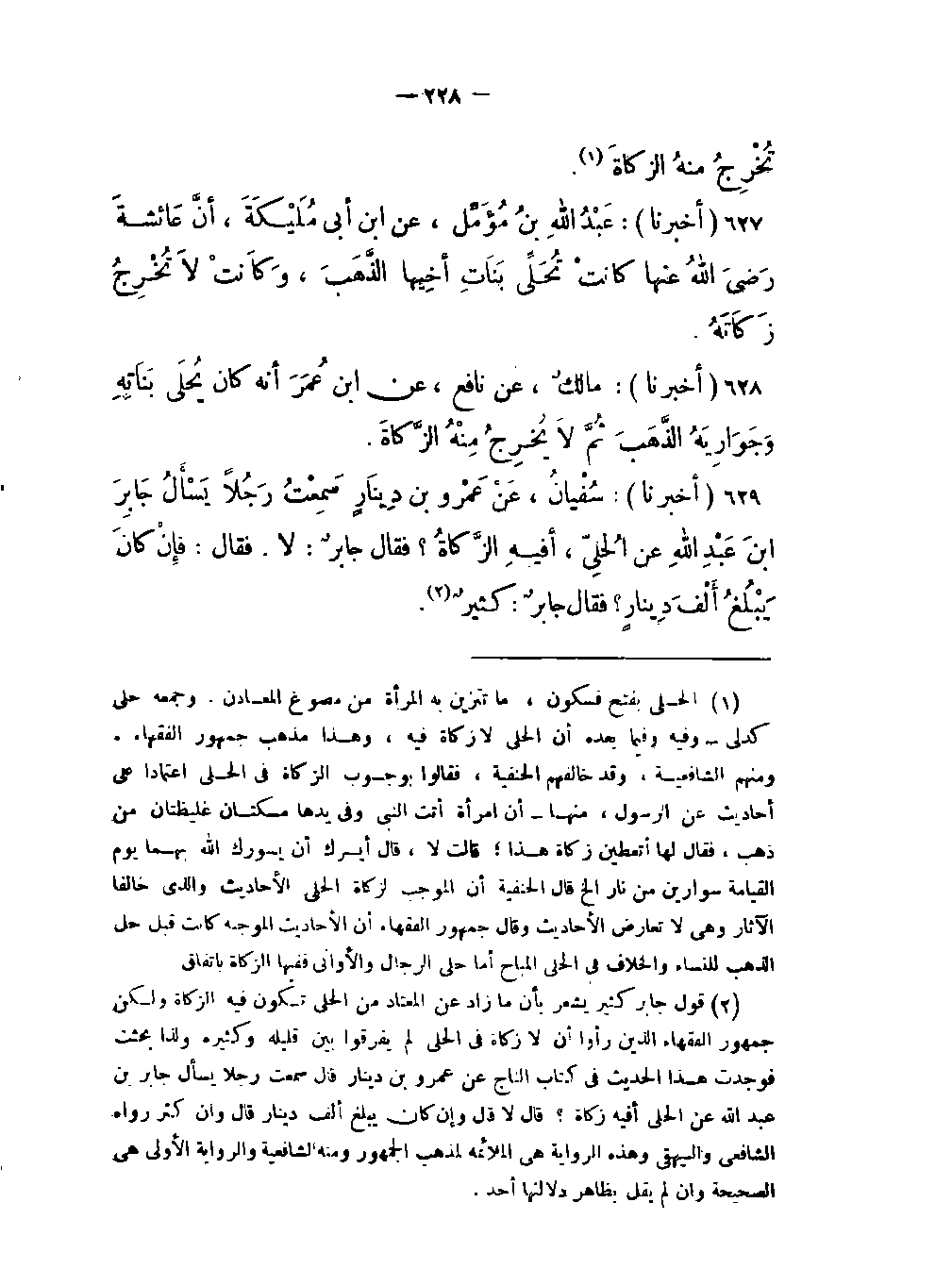 - سَمِعْتُ رَجُلاً يَسْألُ جَابِرَ ابنَ عَبْدِ اللَّهِ عن الحُلِيّ أفيهِ الزَّكاةُ؟ فقال جابرٌ: لا فقال: فإنْ كانَ يَبْلُغُ أَلْفَ دِينَارٍ؟ فقال جابرٌ: كثيرٌ -[229]- (قول جابر كثير يشعر بأن ما زاد عن المعتاد من الحلي تكون فيه الزكاة ولكن جمهور الفقهاء الذين رأوا أن لا زكاة في الحلي لم يفرقوا بين قليله وكثيره ولذا بحثت فوجدت هذا الحديث في كتاب ال؟ اج عن عمرو بن دينار قال سمعت رجلا يسأل جابر بن عبد اللَّه عن الحلي أفيه زكاة؟ قال لا قال وإن كان يبلغ ألف دينار قال وإن كثر رواه الشافعي والبهيقي وهذه الرواية هي الملائمة لمذهب الجمهور ومنه الشافعية والرواية الأولى هي الصحيحة وإن لم يقل بظاهر دلالتها أحد) .