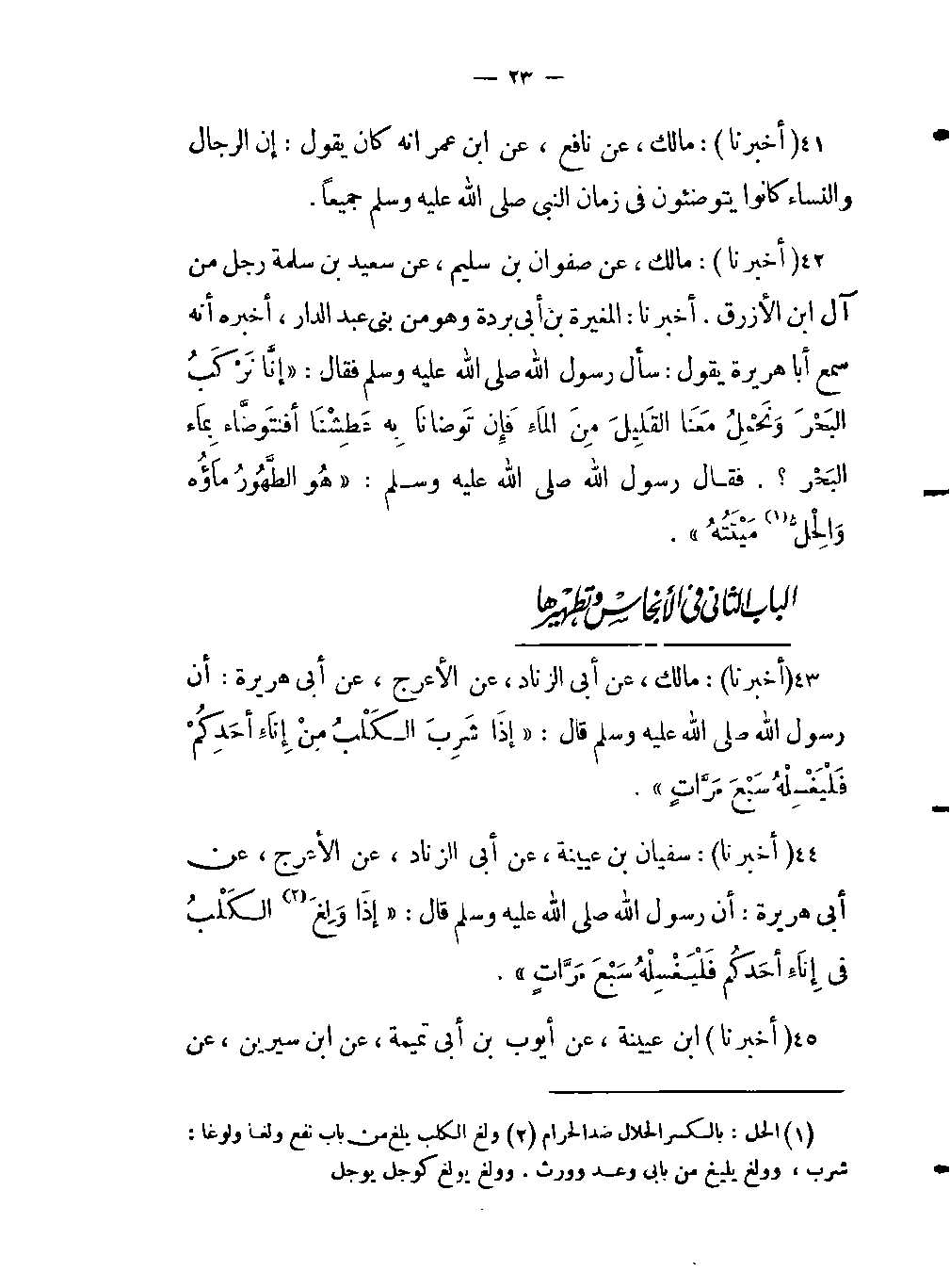 42- (أخبرنا) : مالك، عن صفوان بن سليم، عن سعيد بن سلمة رجل من آل ابن الأزرق. أخبرنا المغيرة بن أبي بردة وهو من بني عبد الدار، أخبره أنه سمع أبا هريرة يقول: