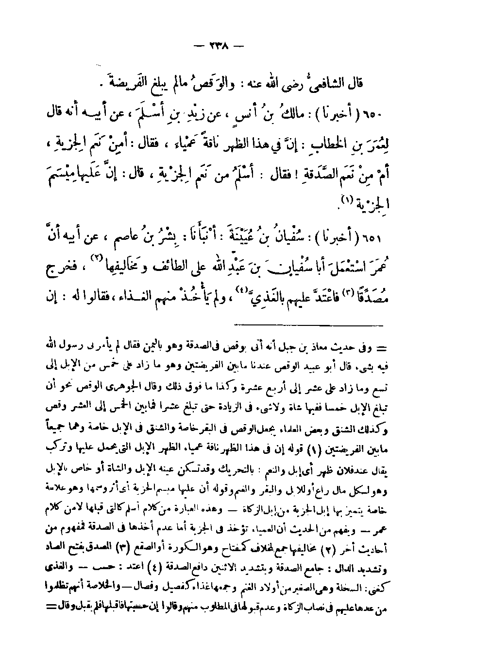 -أنَّ عُمَرَ اسْتَعْمَلَ أبا سُفيانَ بنَ عَبْدِ اللَّه على الطائف ومخَاليفِها (مخاليفها جمع لمخلاف كمفتاح وهو الكورة أو الصقع) فخرج مُصَدِّقًا (المصدق بفتح الصاد وتشديد الدال: جامع الصدقة وبتشديد الإثنين دافع الصدقة) فاعْتَدَّ عليهم بالغَذِيَّ (اعتد: حسب والغذى كغنى: السخلة وهي الصغير من أولاد الغنم وجمعها غذاء كفصيل وفصال والخلاصة أنهم تظلموا من عدها عليهم في نصاب الزكاة وعدم قبولها في المطلوب مهنهم وقالوا إن حسبتها فاقبلها فلم يقبل وقال نعدها ولوكانت محمولة على يد الراعي ولم نقبلها فقد روى أنه شكا إليه أهل الماشية تصديق الغذاء وقالوا إن كنت معتداً علينا بالغذاء فخذ منه صدقته فقال أنا نعتد بالغذاء حتى السخلة يروح بها الراعي على يده) ولم يَأْخُذْ منهم الغذاء فقالوا له: إن -[239]- كنت مُعْتداً علينا بالغذيّ فخُذْ مِنَّا فأمسَكَ حتى لَقي عُمَرُ فقال له اعْلَمْ أنهُمْ يزعُمُون أنك تَظْلِمَهُمْ أتَعْتَدَّ عليهم بالغذيّ ولا تَأْخُذُهُ منهم فقال له عُمَرُ رضي اللَّه عنه فاعْتَدَّ عليهم بالغَذِيَّ حتى بالسَّخلةِ يرُوحُ بها الرَّاعي على يده وقُلْ لهم: لا آخُذُ منكم الرُّبَّى ولا الماخضَ ولا ذاتِ الدّرّ ولا الشَّاةَ الأكولةَ ولا فَحْل الغنم وخُذِ العَنَاق والجَذَعَة والثَّنية فذلك عَدْلٌ بَيْن غَذِيّ المال وخِياره (الربى كحبلى: الشاة القريبة العهد بالولادة وقيل التي تكون في البيت لأجل اللبن والماخض التي قاربت الولادة وذات الدر الوالدة والأكولة السمينة والعناق بفتحتين الأنثى من ولد المعز قبل استكمالها الحول والجذعة بفتحات ولد الشاة في السنة الثانية والثنية من ذوات الظلف والحافر وهي التي ألقت ثنيتها وذلك لا يكون إلا في السنة الثالثة وقوله فذلك عدل بين غذي المال وخياره أي بين صغاره وكباره والمراد بالحديث أخذ الوسط لا الصغير ولا الضعيف ولا الجيد الممتاز) .