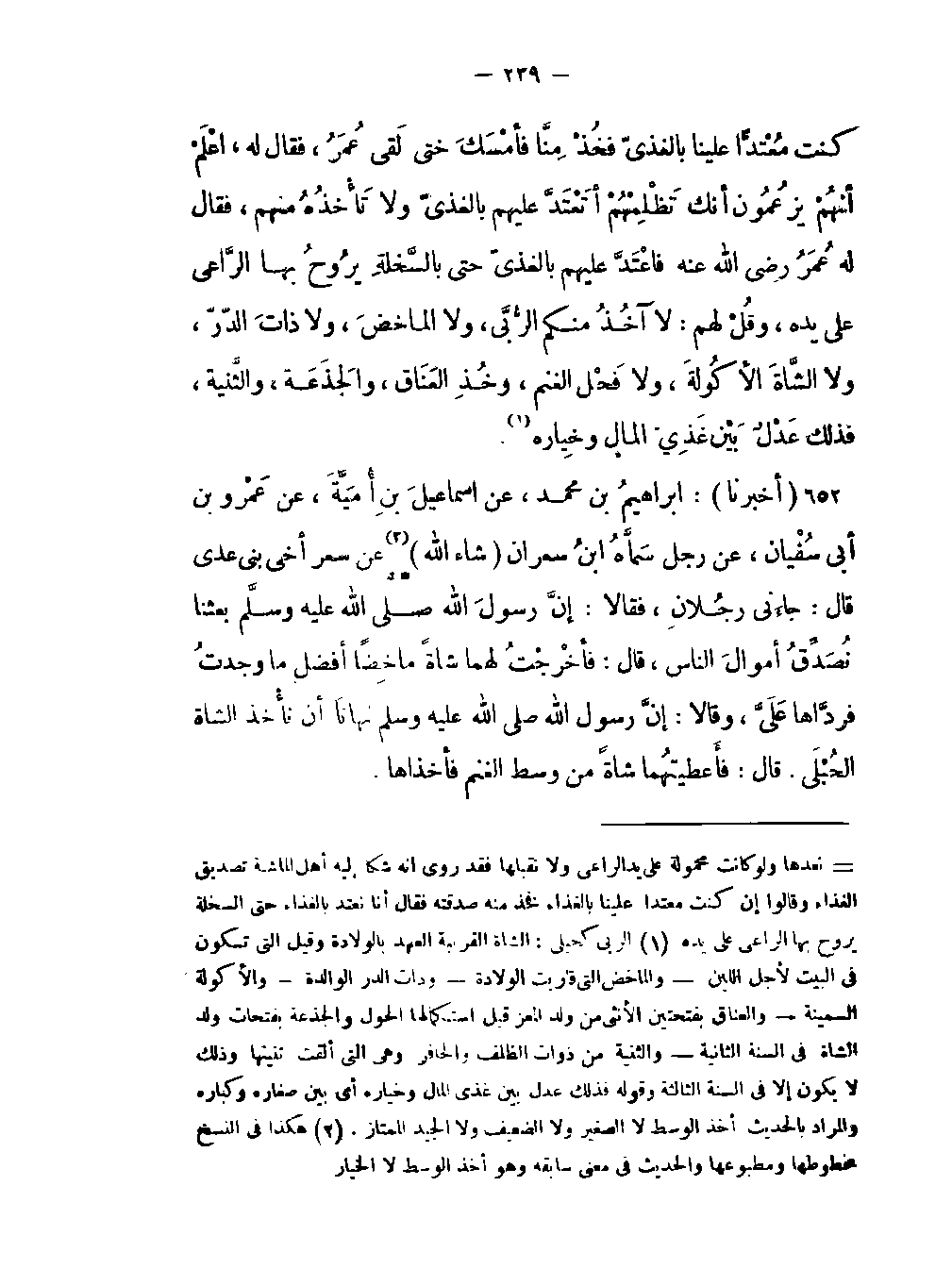 - جاءَني رجُلانِ فقالا: إنَّ رسول اللَّه صلى اللَّه عليه وسلَّم بعثنا نُصَدِّقُ أموالَ الناس قال: فَأخْرَجْتُ لهما شاةً ماخِضاً أفضل ما وجدتُ فردَّاها عَلَيَّ وقالا: إنَّ رسول اللَّه صلى اللَّه عليه وسلم نهانا أن نأْخذ الشاة الحُبْلَى قال: فأَعطيتُهما شاةً من وسط الغنم فأخذاها.