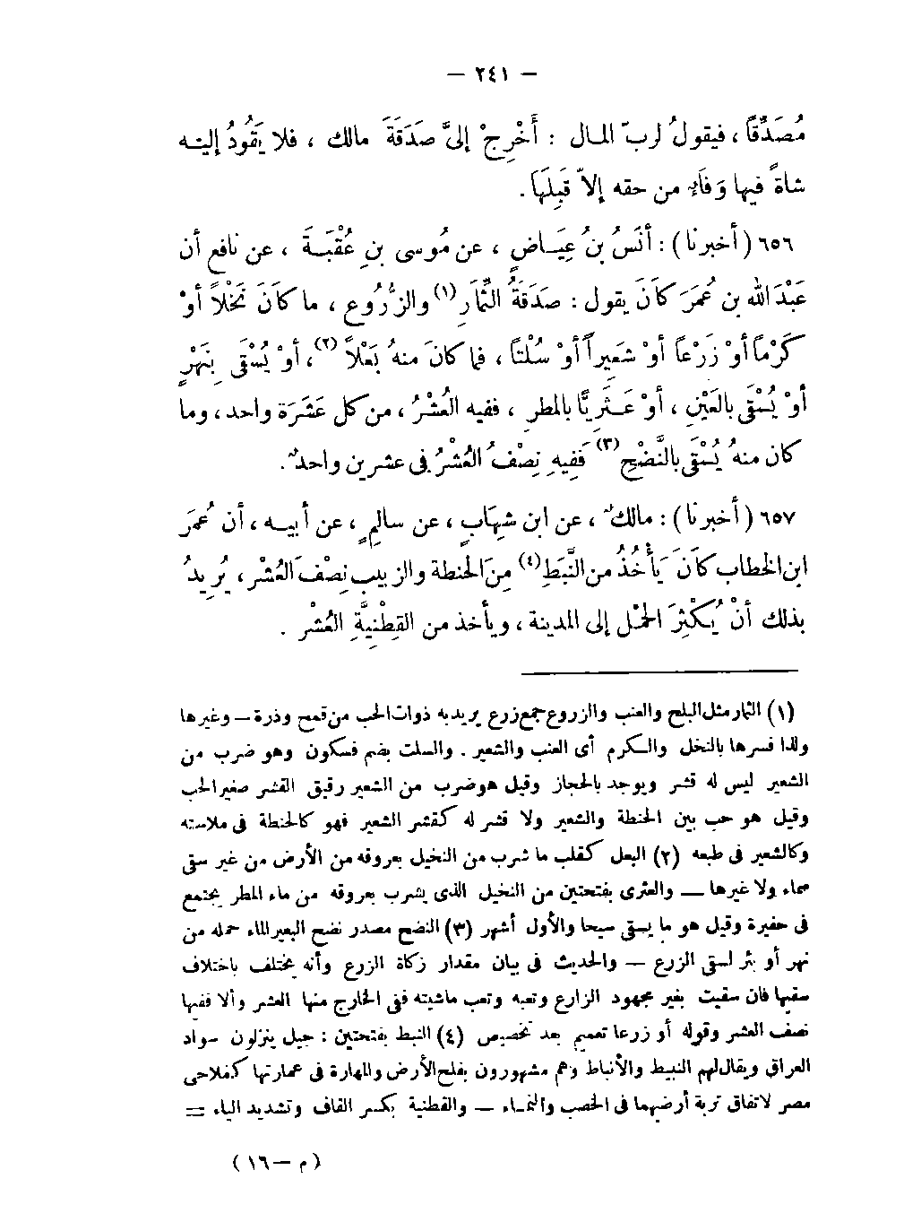 -أن عُمَرَ بن الخَطاب كَانَ يَأْخُذُ من النَّبَطِ (النبط بفتحتين: جيل ينزلون سواد العراق ويقال لهم النبيط والأنباط وهم مشهورون بفلح الأرض والمهارة في عمارتها كفلاحي مصر لاتفاق تربة أرضيهما في الخصب والنماء والقطنية بكسر القاف وتشديد الياء أو تخفيفها وضم القاف لغة: واحدة القطاني وهي الحبوب التي تدخر كالحمص والعدس والترمس والأرز والجلبان والباقلى وقال شمر: القطنية ما سوى الحنطة والشعير والزبيب والتمر وقال غيره هي اسم جامع للحبوب التي تطبخ وقال الأزهري هي مثل العدس والفول واللوبيا والحمص وما شاكلها مما يقتات سماها الشافعي كلها قطنية فيماروى عنه الربيع وكلمة الزبيب كانت في الأصل الزيت وهو تصحيف بين لأن الزيت لا زكاة فيه وليس مما تخرج الأرض والمدار في إيجاب زكاة الزرع عند الشافعية على الإفتيات والإدخار) من الحنطة والزبيب نِصْفَ العُشْر يُرِيدُ بذلك أنْ يُكْثِرَ الحمْل إلى المدينة ويأخذ من القِطْنِيَّةِ العُشْر.