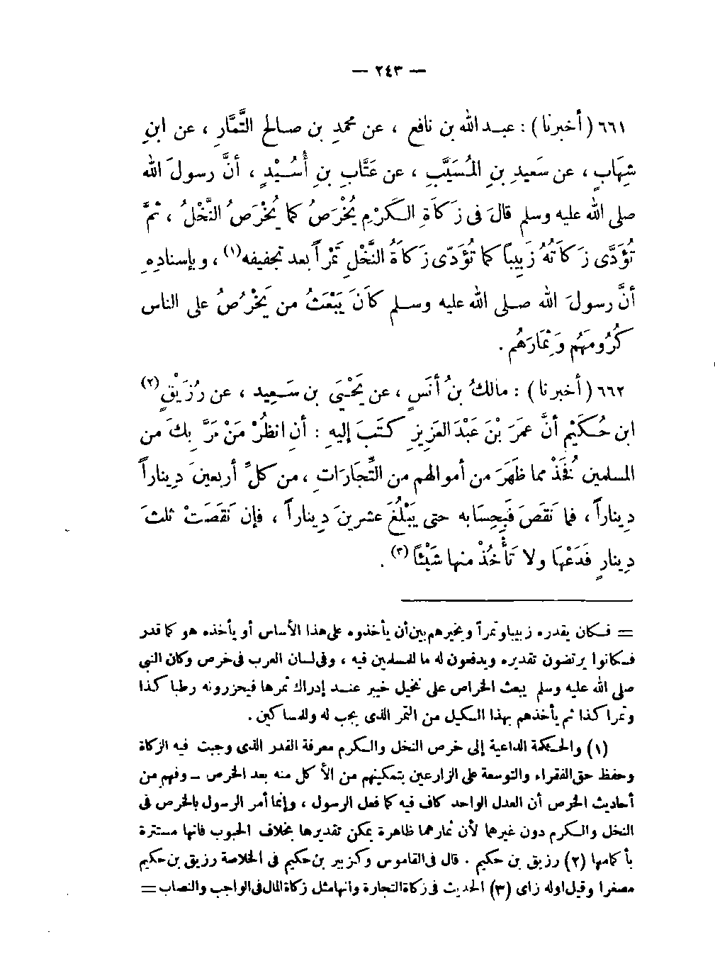 -أنَّ رسول اللَّه صلى اللَّه عليه وسلم قالَ في زَكَاةِ الكَرْمِ يُخْرَصُ كما يُخْرَصُ النَّخْلُ ثمَّ تُؤَدَّى زكَاتُهُ زَبِيباً كما تُؤَدَّى زَكَاةُ النَّخْلِ تَمْراً بعد تجفيفه (والحكمة الداعية إلى خرص الكرم والنخل معرفة القدر الذي وجبت فيه الزكاة وحفظ حق الفقراء والتوسعة على الزارعين بتمكينهم من الأكل منه بعد الخرص وفهم من أحاديث الخرص أن العدل الواحد كاف فيه كما فعل الرسول وإنما أمر الرسول بالخرص في النخل والكرم دون غيرهما لأن ثمارهما ظاهرة يمكن تقديرها بخلاف الحبوب فإنها مستترة بأكمامها) وبإسنادِهِ أنَّ رسول اللَّه صلى اللَّه عليه وسلم كَانَ يَبْعَثُ من يَخْرُصُ على الناس كُرُومَهُم وَثِمَارَهُم.