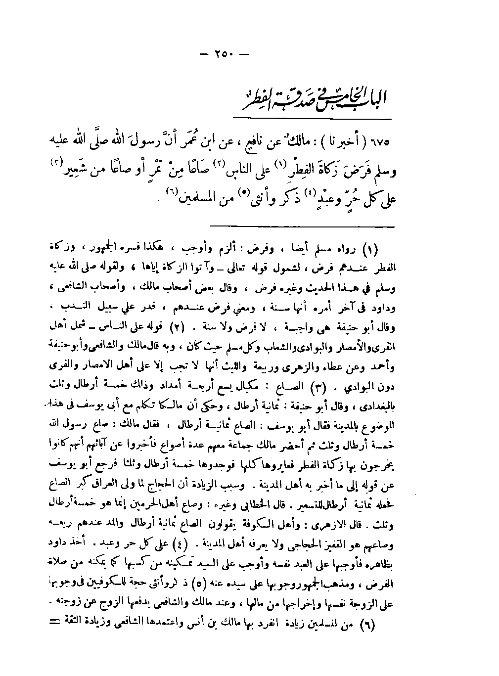 -أنَّ رَسولَ اللَّه صلى اللَّه عليه وسلم فَرَضَ زَكاةَ الفِطْرِ (رواه مسلم أيضا وفرض: ألزم وأوجب هكذا فسره الجمهور وزكاة الفطر عندهم فرض لشمول قوله تعالى وآتوا الزكاة إياها ولقوله صلى اللَّه عليه وسلم في هذا الحديث وغيره فرض وقال بعض أصحاب مالك وأصحاب الشافعي وداود في آخر أمره أنها سنة ومعنى فرض عندهم قدر على سبيل الندبوقال أبو حنيفة هي واجبة لا فرض ولا سنة) على الناس (قوله على الناس شمل أهل القرى والأمصار والبوادي والشعاب وكل مسلم حيث كان وبه قال مالك والشافعي وأبو حنيفة وأحمد وعن عطاء والزهري وربيعة والليث أنها لا تجب إلا على أهل الأمصار والقرى دون البوادي) صَاعاً مِنْ تَمْرٍ أو صَاعاً من شَعِير (الصاع: مكيال يسع أربعة أمداد وذلك خمسة أرطال وثلث بالبغدادي وقال أبو حنيفة: ثمانية أرطال وحكى أن مالكاً تكلم مع أبي يوسف في هذا الموضوع بالمدينة فقال أبو يوسف: الصاع ثمانية أرطال فقال مالك: صاع رسول الله خمسة أرطال وثلث ثم أحضر مالك جماعة معهم عدة أصواع فأخبروا عن آبائهم أنهم كانوا يخرجون بها زكاة الفطر فعايروها كلها فوجدوها خمسة أرطال وثلثا فرجع أبو يوسف عن قوله إلى ما أخبر به أهل المدينة وسبب الزيادة أن الحجاج لما ولى العراق كبر الصاع فجعله ثمانية أرطال للتسعير قال الخطابي وغيره: وصاع أهل الحرمين إنما هو خمسة أرطال وثلث قال الأزهري: وأهل الكوفة يقولون الصاع ثمانية أرطال والمد عندهم ربعه وصاعهم هو القفيز الحجاجي ولا يعرفه أهل المدينة) على كل حُرٍّ وعبْدٍ (على كل حر وعبد أخذ داود بظاهره فأوجبها على العبد نفسه وأوجب على السيد تمكينه من كسبها كما يمكنه من صلاة الفرض ومذهب الجمهور وجوبها على سيده عنه) ذكر وأنثى (ذكروأنثى حجة للكوفيين في وجوبها على الزوجة نفسها وإخراجها من مالها وعند مالك والشافعي يدفعها الزوج عن زوجته) من المسلمين