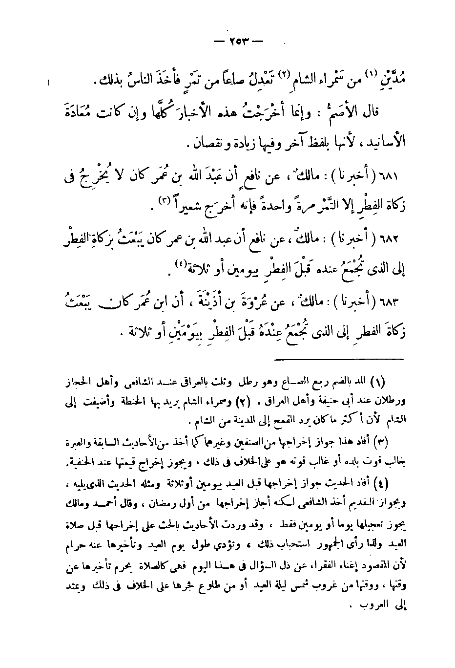 -أن عَبْدَ اللَّه بن عُمَر كان يَبْعَثُ بزَكاةَ الفِطْرِ إلى الذي تُجِمَعُ عنده قَبْلَ الفِطْرِ بيومين أو ثلاثة (أفاد الحديث جواز إخراجها قبل العيد بيومين أو ثلاثة ومثله الحديث الذي يليه وبجواز القديم أخذ الشافعي لكنه أجاز إخراجها من أول رمضان وقال أحمد ومالك يجوز تعجيلها يوما أو يومين فقط وقد وردت الأحاديث بالحث على إخراجها قبل صلاة العيد ولذا رأى الجمهور استحباب ذلك وتؤدي طول يوم العيد وتأخيرها عنه حرام لأن المقصود إغناء الفقراء هم ذل السؤال في هذا اليوم فهي كالصلاة يحرم تأخيرها عنوقتها ووقتها من غروب شمس ليلة العيد أو من طلوع فجرها على الخلاف في ذلك ويمتد إلى الغروب) .