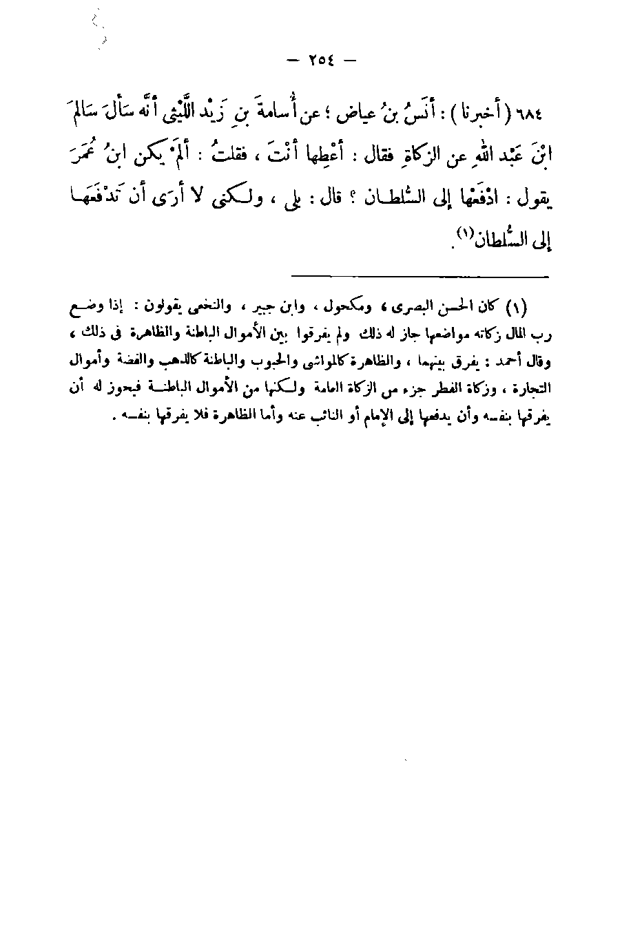 -أنَّه سَألَ سَالمَ ابْنَ عَبْد اللَّهِ عن الزكاةِ فقال: أعْطِها أنْتَ فقلتُ: ألَمْ يكن ابنُ عُمَرَ يقول: ادْفَعْها إلى السُّلطان؟ قال: بلى ولكني لا أرَى أن تَدْفَعَها إلى السُّلطان -[255]- (كان الحسن البصري ومكحول وابن جبير والنخعي يقولون: إذا وضع رب المال زكاته مواضعها جاز له ذلك ولم يفرقوا بين الأموال الباطنة والظاهرة في ذلك وقال أحمد: يفرق بينهما والظاهرة كالمواشي والحبوب الباطنة كالذهب والفضة وأموال التجارة وزكاة الفطر جزء من الزكاة العامة ولكنها من الأموال الباطنة فيجوز له أن يفرقها بنفسه وأن يدفعها إلى الإمام أو النائب عنه وأما الظاهرة فلا يفرقها بنفسه) .