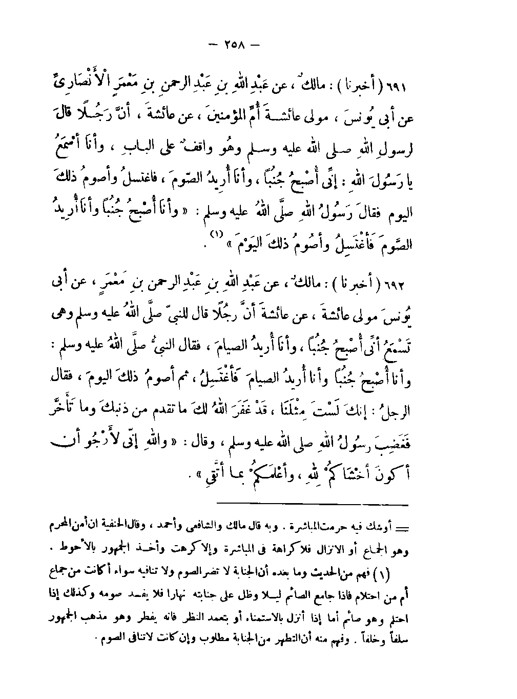 -أنَّ رَجُلاً قالَ لرسول اللَّه صلى اللَّه عليه وسلم وهُو واقفٌ على البابِ وأناَ أسْمَعُ يا رَسُولَ اللَّهِ: إنِّي أُصْبِحُ جُنُباً وأنَا أُرِيدُ الصّومَ فاغتسلُ وأصومُ ذلكَ اليوم فقالَ رسولُ اللَّهِ صلى اللَّه عليه وسلم: «وأنا أُصْبِحُ جُنُباً وأنَا أُرِيدُ الصّومَ فاغتسلُ وأصومُ ذلكَ اليومَ (فهم من الحديث وما بعده أن الجنابة لا تضر الصوم ولا تنافيه سواء أكانت من جماع أم من احتلام فإذا جامع الصائم ليلا وظل على جنابته نهارا فلا يفسد صومه وكذلك إذا احتلم وهو صائم أما إذا أنزل بالاستمناء أو بتعمد النظر فإنه يفطر وهو مذهب الجمهور سلفا وخلفاً وفهم منه أن التطهر من الجنابة مطلوب وإن كانت لا تنافي الصوم) » .