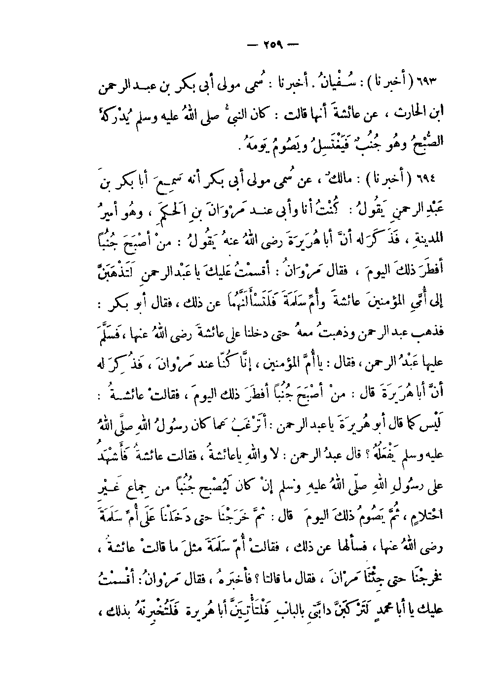 -كُنْتُ أنا وأبي عند مَرْوَانَ بنِ الحَكَمِ وهُو أميرُ المدينةِ فَذَكَرَ له أنَّ أبا هُرَيرَةَ رضي اللَّهُ عنهُ يقُولُ: منْ أصْبَحَ جُنُباً أفطَرَ ذلكَ اليومَ فقالَ مَرْوَانَ أقسمْتُ عَليكَ يا عَبْد الرحمنِ لَتَذْهَبَنَّ إلى أُمِّي المؤنينَ عائشةَ وأُمِّ سَلَمَةَ فَلَتَسْأَلَنَّهُما عن ذلك فقال أبو بكر: فذهب عبدُ الرحمن: وذهبتُ معهُ حتى دخلنا على عائشةَ رضي اللَّه عنها فَسَلَّمَ عليها عَبْدُ الرحمن فقال: يا أُمَّ المؤمنينَ إنَّا كُنّا عند مَرْوَانَ فَذُكِرَ له أنَّ أبا هُرَيرَةَ قال: منْ أصْبَحَ جُنُباً أفطَرَ ذلكَ اليومَ فقالَتْ عائشةُ: لَيْسَ كما قال أبو هُرَيرَةَ يا عبد الرحمن: أتَرْغَبُ عَما كان رسُولِ اللَّهِ صلى اللَّهُ عليه وسلم يَفْعَلُهُ؟ قال عبدُ الرحمن: لا واللَّهِ يا عائشةُ فقالت عائشةُ فَأَشْهَدُ على رسُولِ اللَّهِ صلى اللَّهُ عليه وسلم إنْ كان لَيُصْبح جُنُباً من جِماع غَيْرَ احْتلامٍ ثُمَّ يَصُومُ ذلكَ اليومَ قال: ثمَّ خَرَجْنا حتى دَخَلْنَا عَلَى أُمِّ سَلَمَةَ رضي اللَّهُ عنها فسألها عن ذلك فقالتْ أُمِّ سَلَمَةَ مثلَ ما قالتْ عائشةُ فخَرَجْنا حتى جِئْنَا مَرْوانَ فقال ما قالتا؟ فأخبَرهُ فقال مَرْوَانُ أقسمْتُ عَليكَ يا أبا أحمد لَتَرْكبَنَّ دابَّتِي فَلَتَأْتِيَنَّ أبا هُرَيرَةَ فَلَتُخْبِرَنَّهُ بذلك -[260]- فَرَكِبَ عَبْدُ الرَّحْمن ورَكِبْتُ مَعَهُ حتى أتَيْنَا أبا هُرَيرَةَ فَتَحَدَّثَ معهُ عَبْدُ الرَّحْمن ساعةً ثمَّ ذكَرَ لهُ ذلك فقال أبو هُرَيرَةَ: لا عِلْمَ لي بذلكَ إنما أخْبَرَنيه مُخْبر (المخبر الذي أخبره بقوله من أدركه الفجر جنبا فلا يصم وفي رواية أفطر هو الفضل ابن عباس قال أبو هريرة: سمعت ذلك من الفضل ولم أسمعه من النبيُّ صلى اللَّه عليه وسلم وفي رواية أخرى أسامة بن زيد ويحمل على أنه سمعه منهما وفي مسلم فقال أبو هريرة: أهما (عائشة وأم سلمة) قالتاه لك؟ يخاطب عبد الرحمن قال نعم قال: هما أعلم قال: فرجع أبو هريرة عما كان يقول في ذلك وقد أجمع علماء الأمصار على صحة صوم الجنب سواء أكان من احتلام أم من جماع وإنما رجع أبو هريرة عما رواه لأنه رأى أن حديث عائشة وأم سلمة أولى بالإعتماد لأنهما أعلم بمثل هذا من غيرهما ولأنه موافق لقوله تعالى (فالآن باشروهن) الآية فقد أجازت الجماع إلى طلوع الفجر وهذا يستلزم أن يصبح جنبا ويصح صومه وأما الحديث الذي رواه مخالفاً لذلك فيمكن حمله على من أدركه الفجر مجامعا فاستمر في جماعه فإنه يفطر أو نقول إنه إرشاد إلى الأفضل وإنما تركه الرسول أحيانا للبيان والتعليم كما ترك الطواف ماشيا وطاف راكبا في بعض الأحيان مع أنه خلاف الأفضل لكن البيان يجعله أفضل وقد قيل أن حديث أبي هريرة كان في أول الإسلام حين كان الجماع محرما في الليل بعد النوم كالطعام والشراب ثم نسخ ذلك ولم يعلمه أبو هريرة فكان يفتي به حتى بلغه الناسخ فرجع إليه) .