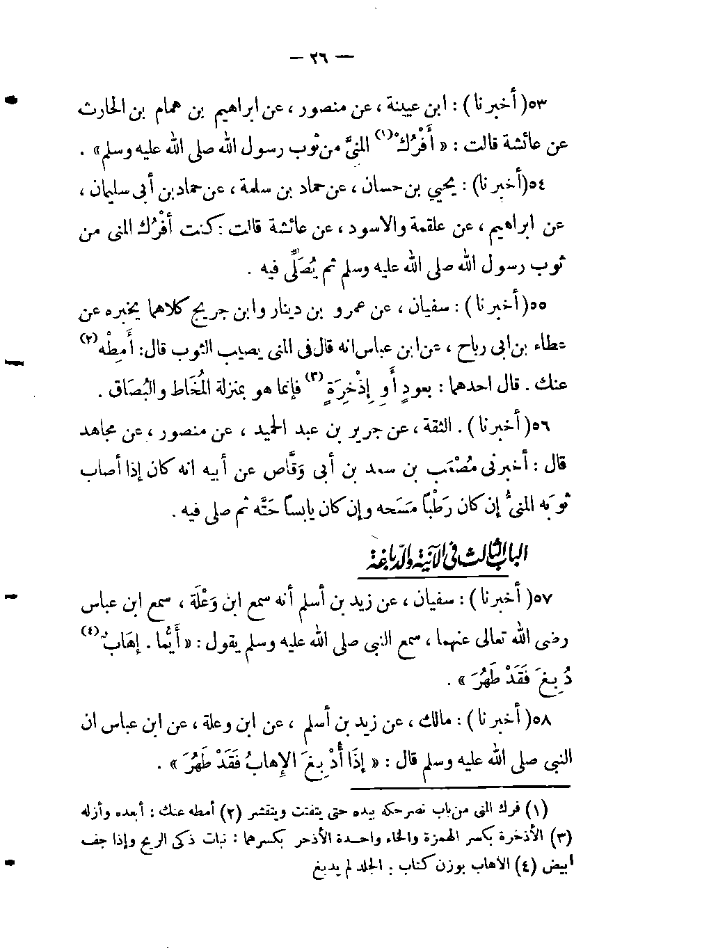 - أنه قال في المنى يصيب الثوب قال: أَمِطْه (أبعده وأزله) عنك. قال احدهما: بعودٍ أَوْ إِذْخِرَةٍ (بكسر الهمزة والخاء واحدة الأذخر بكسرهما: نبات ذكي الريح وإذا جف أبيض) فإنما هو بمنزلة المُخَاط والبُصَاق.